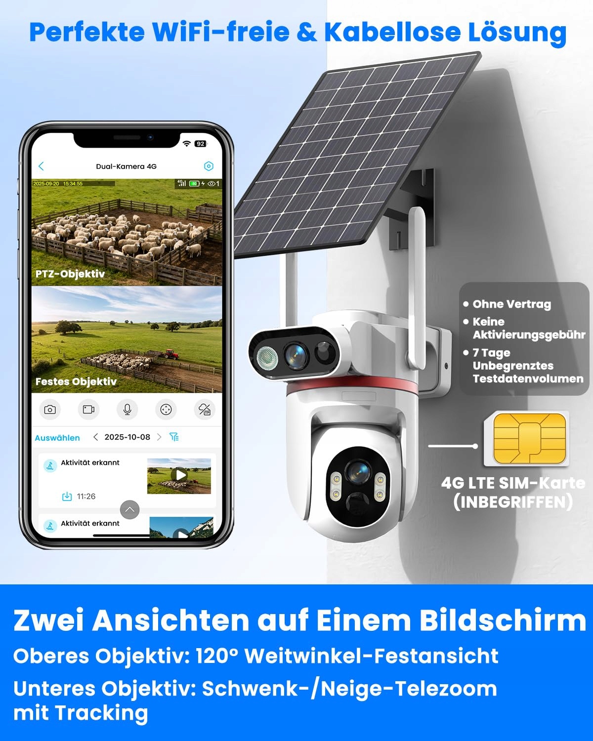 【Całkowite wykrywanie ruchu – automatyczne śledzenie i powiadomienia】Monitoruj swoją posesję w czasie rzeczywistym: ruch jest wykrywany, a Ty otrzymujesz natychmiastowe powiadomienia. System PTZ tej kamery 4G z kartą SIM automatycznie śledzi wykryte ruchy i zapewnia pełne pokrycie, dzięki czemu Twój teren jest zawsze bezpiecznie monitorowany.