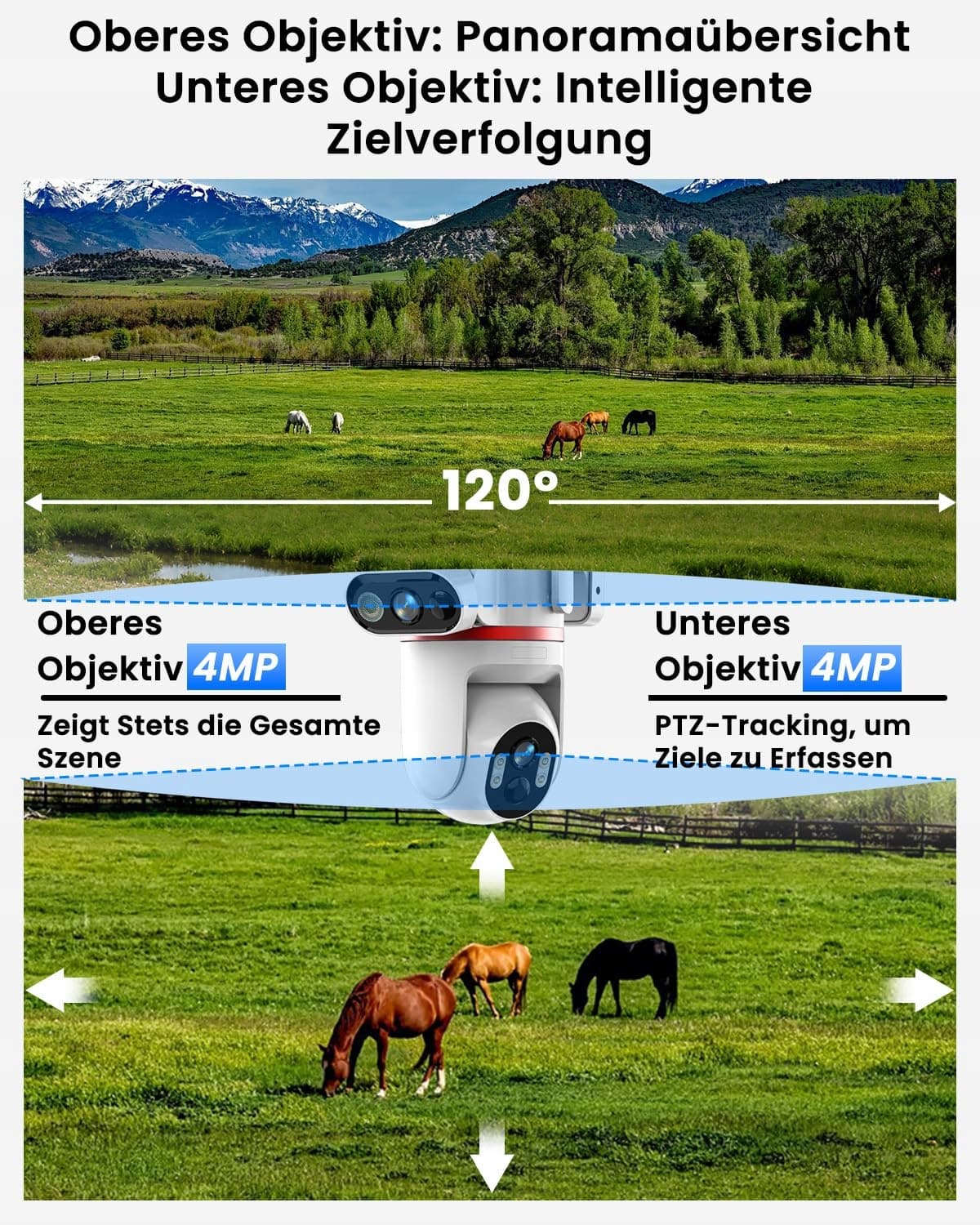 【Podwójne obiektywy 4MP – ultra-szerokokątny + PTZ z 4× zoomem dla każdego detalu】Oba obiektywy dostarczają wysokiej rozdzielczości obraz 4MP. Górna kamera rejestruje szerokie sceny z ultra-szerokim kątem 120°, podczas gdy dolny obiektyw PTZ oferuje obrót poziomy 360°, pochylenie 120° i 4× zoom cyfrowy, dzięki czemu możesz dokładnie monitorować detale i precyzyjnie śledzić ruchy.