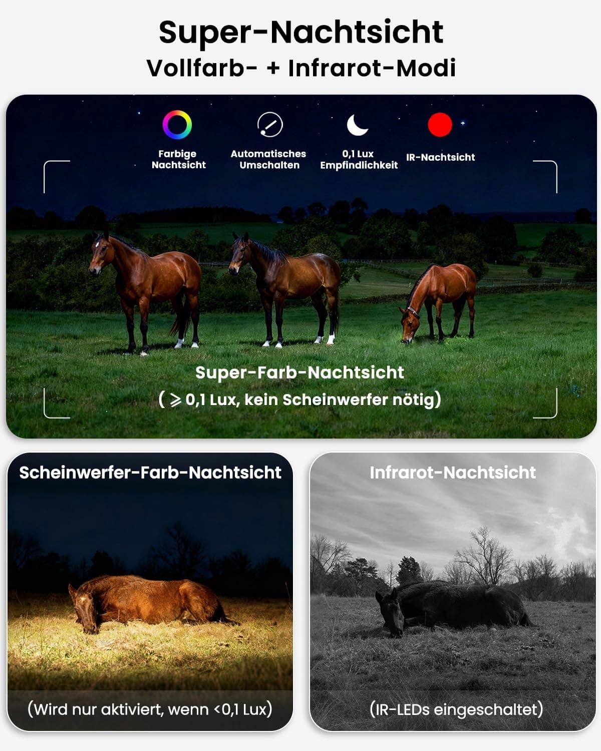 【Prawdziwy kolorowy obraz nocny – brak światła, brak zakłóceń】W nocy ciesz się żywymi, pełnokolorowymi nagraniami z tej kamery monitoringu bez Wi-Fi, całkowicie bez reflektorów. Bez rażącego światła, które przyciąga owady, przestrasza zwierzęta domowe lub przeszkadza sąsiadom, Twój widok pozostaje jasny i dostarcza ważnych kolorowych szczegółów do precyzyjnej identyfikacji.