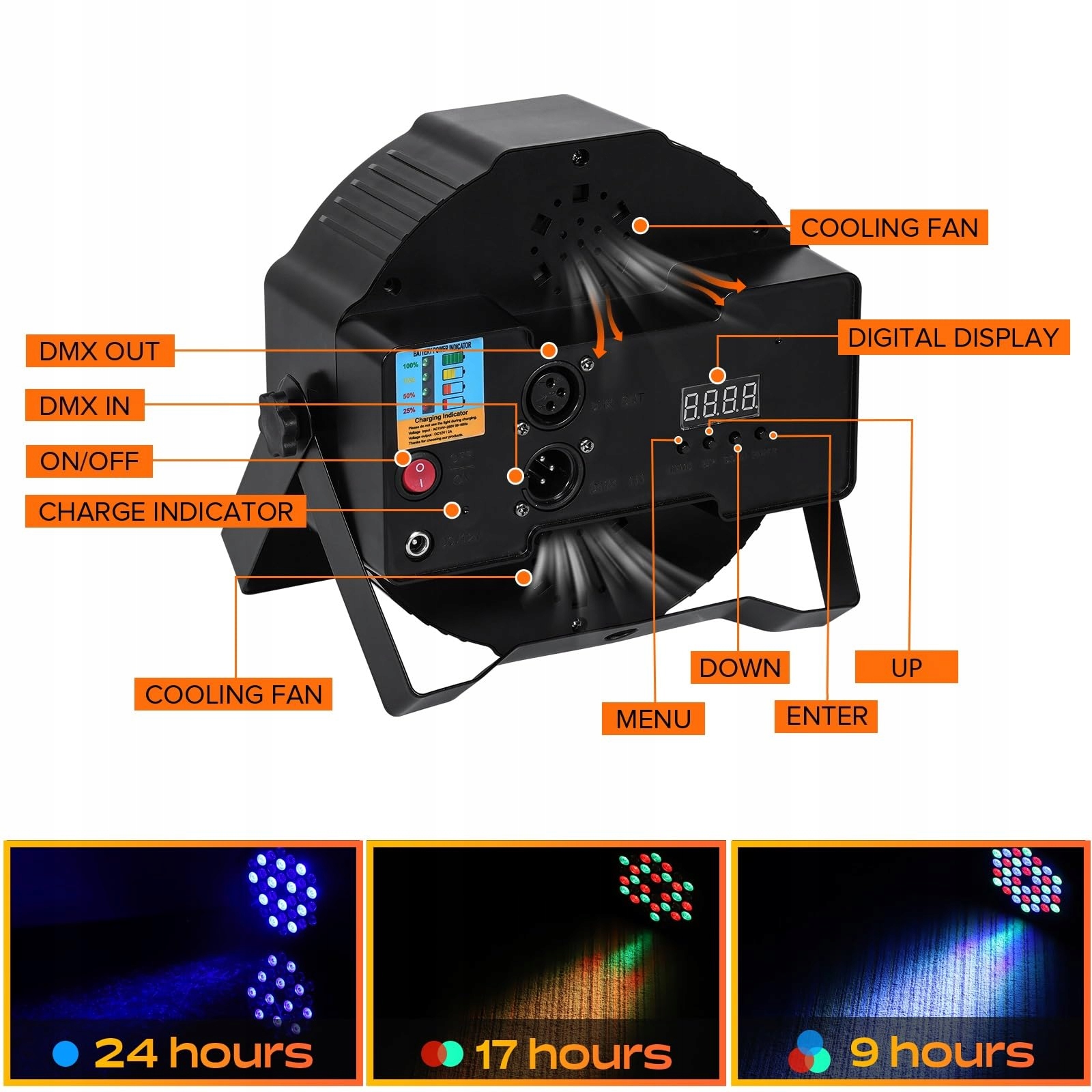 Akumulatorowy LED Par: LED światło imprezowe z akumulatorem może działać 4-12 godzin przy pełnym naładowaniu, brak przewodów zasilających, które przeszkadzają na scenie i imprezie, nie ma potrzeby instalowania ich blisko gniazdka