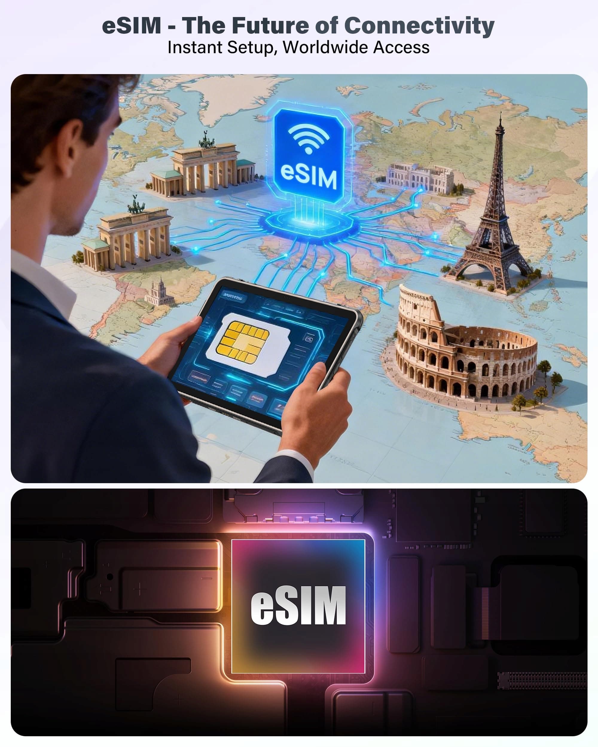 【eSIM & 4G LTE - Nieograniczona łączność】Ulefone RugKing Pad 2 Pro 256GB wytrzymały tablet rewolucjonizuje Twoją mobilną pracę dzięki wbudowanej technologii eSIM i łączności 4G LTE. eSIM pozwala na natychmiastową aktywację sieci bez fizycznej karty SIM – aktywuj taryfy online i zmieniaj operatorów za pomocą kilku kliknięć. Połączony z potężną łącznością 4G LTE ten wodoodporny tablet gwarantuje ultraszybkie pobieranie, bezpieczne przesyłanie danych i niezawodny dostęp do internetu, niezależnie czy na budowie, w terenie czy w podróży.