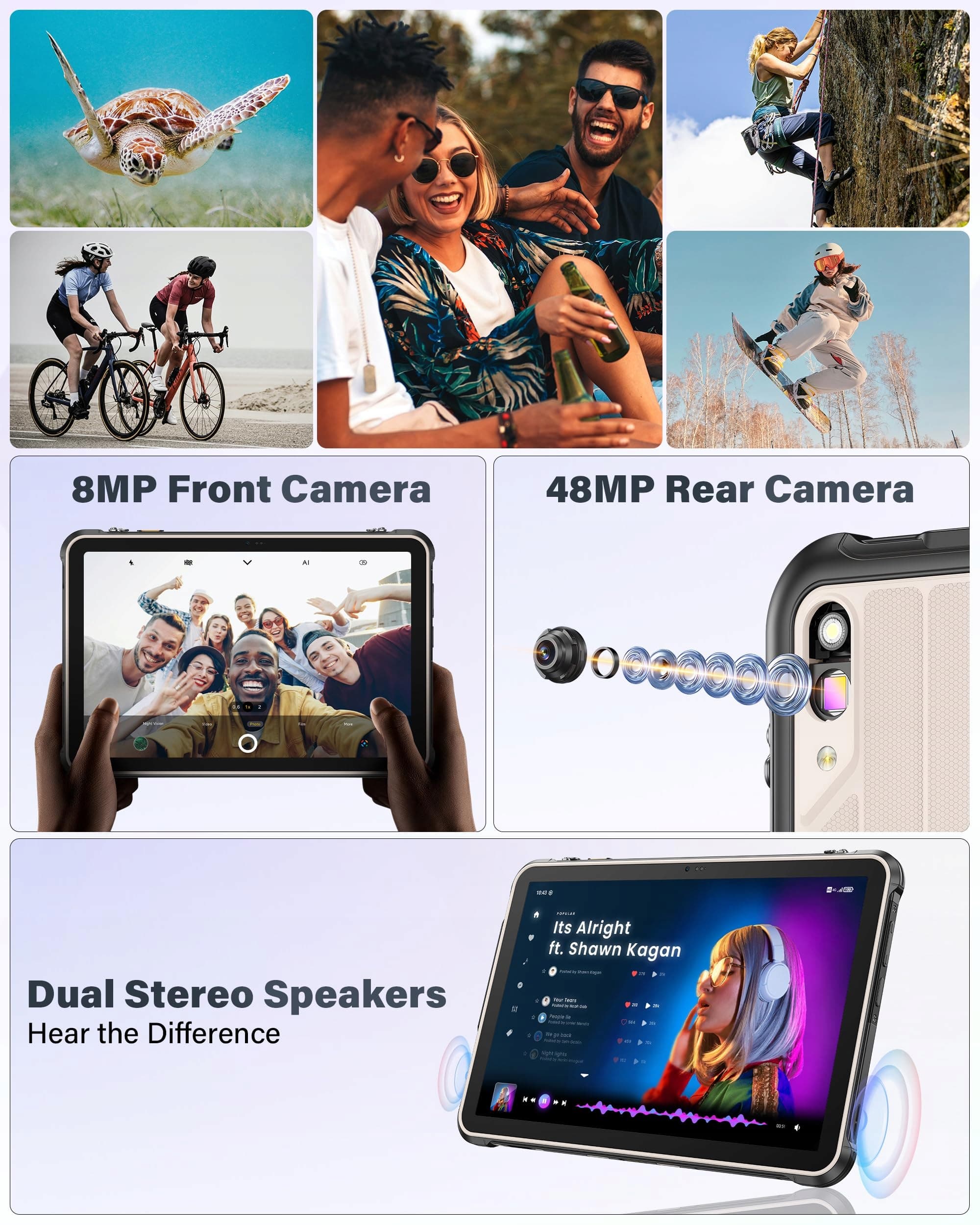 【Podwójne głośniki stereo & rozbudowane funkcje dodatkowe】RugKing Pad 2 Pro wytrzymały tablet imponuje podwójnymi symetrycznymi głośnikami dla potężnego dźwięku multimedialnego oraz bogactwem profesjonalnych funkcji: NFC, nawigacja Multi-GNSS (GPS/GLONASS/Beidou/Galileo), 3 sloty na karty, programowalny przycisk, tryb rękawiczek i skrzynka narzędzi outdoorowych czynią ten tablet outdoorowy wszechstronnym narzędziem pracy. Wodoodporny tablet posiada także złącze słuchawkowe 3,5 mm, radio FM bez zestawu słuchawkowego, Face Unlock & Fingerprint ID oraz Widevine L1 dla strumieniowania HD.