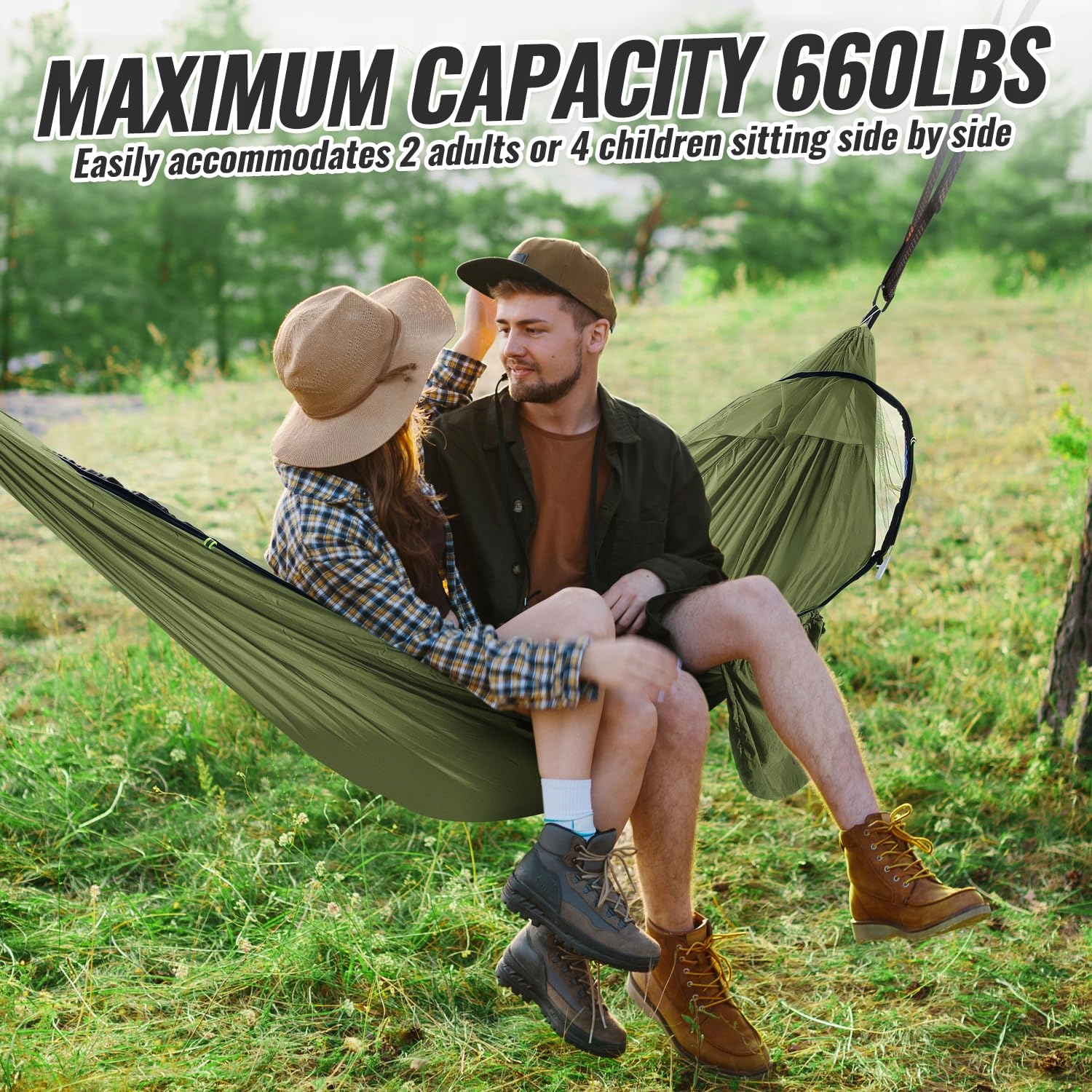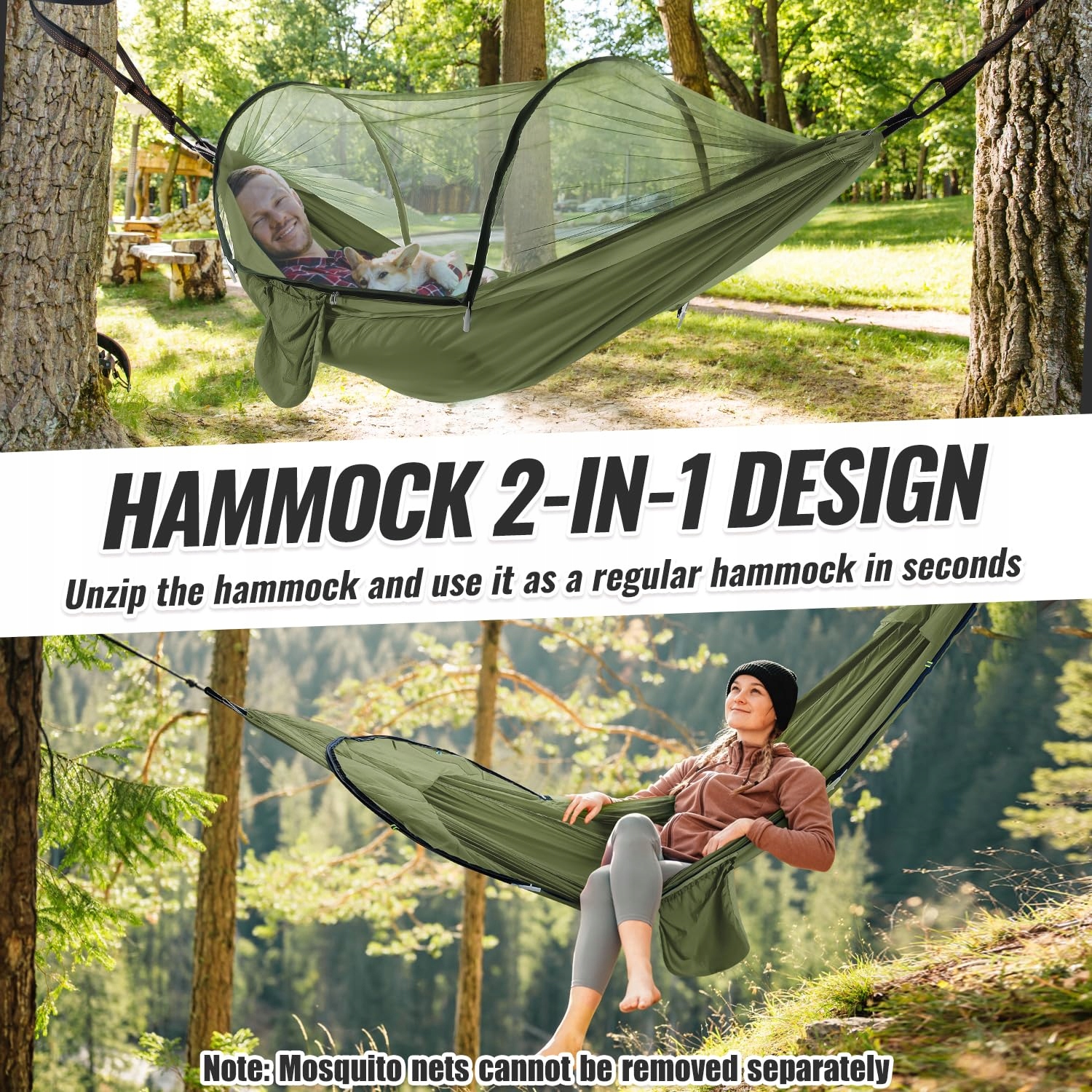 ODDYCHAJĄCA SIATKA WYSOKIEJ JAKOŚCI: Moskitiera jest bezszwowo przyszyta do hamaka campingowego, zapewnia natychmiastową ochronę i nie wymaga oddzielnego zawieszania. Siatki o wysokiej gęstości skutecznie chronią przed przerażającymi robakami i komarami. Dzięki temu możesz bezpiecznie cieszyć się czasem spędzonym na kempingu. Gdy moskitiera nie jest używana, można ją całkowicie otworzyć, co jest wygodne i praktyczne.