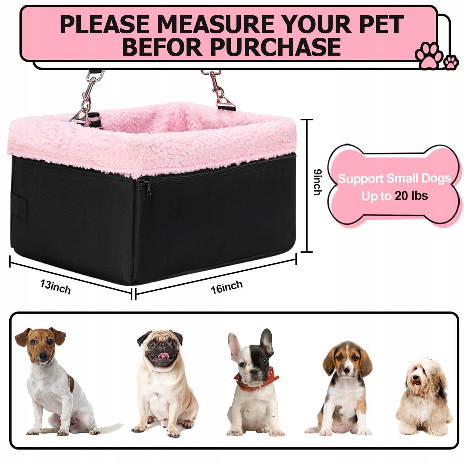 ODPOWIEDNI DLA MAŁYCH PSÓW I KOTÓW - Wymiary tego fotelika samochodowego dla małych psów to 16L x 13W x 9H cali. Ze względu na indywidualne różnice między zwierzętami domowymi, proszę zmierzyć swoje zwierzęta przed zakupem. Polecamy go dla małych psów lub kotów do wagi 20 funtów.