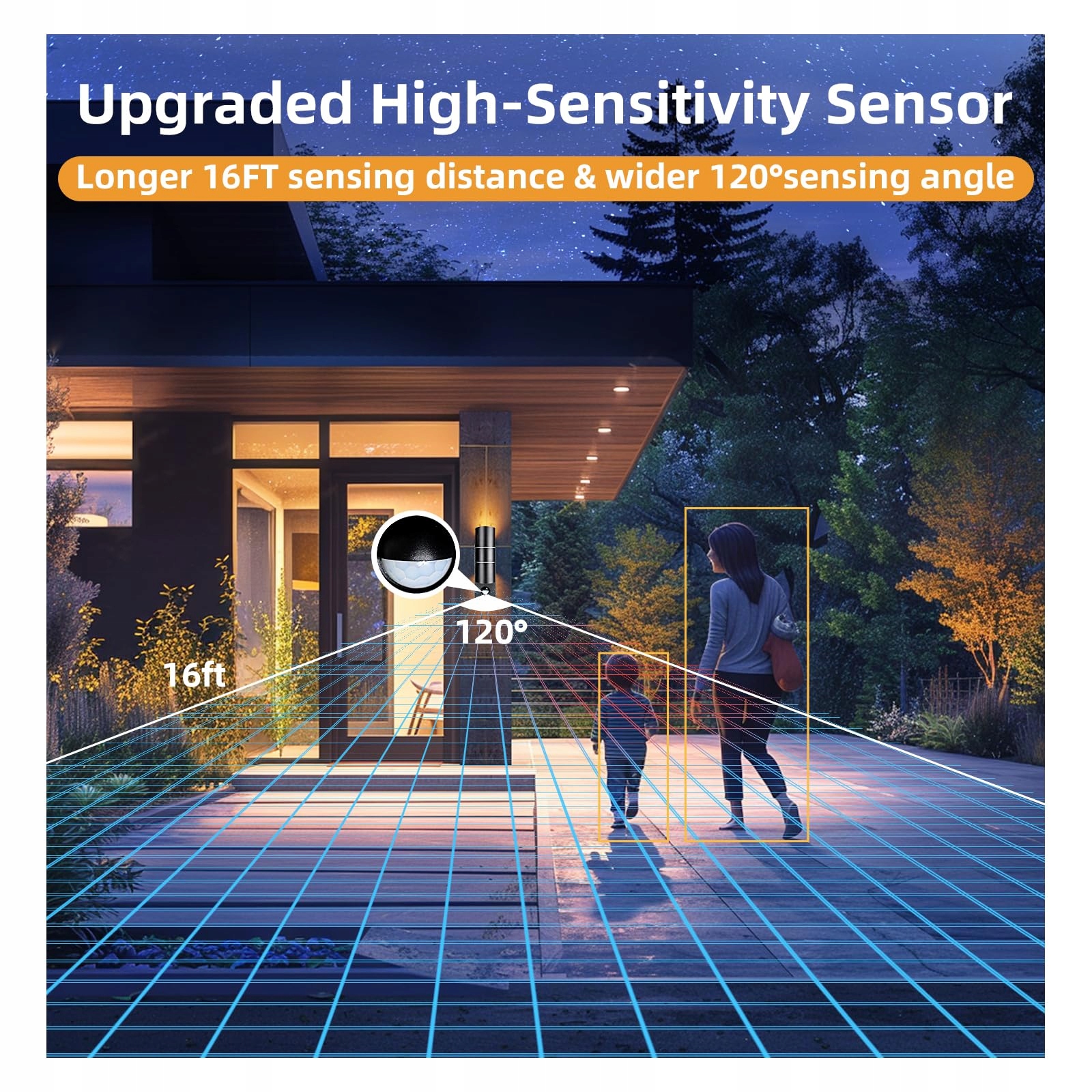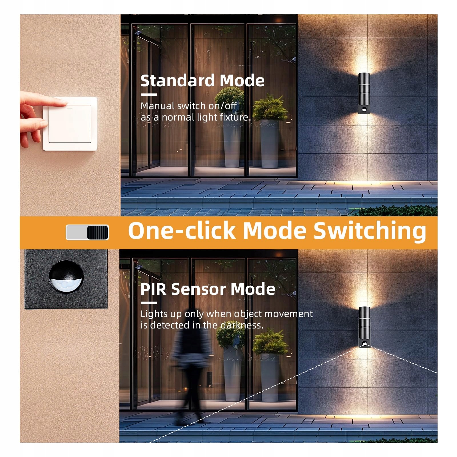 【Inteligentne lampy zewnętrzne z elastycznością dwóch trybów】Wysokoczułe czujniki ruchu i światła z kątem widzenia 120° i zasięgiem 5 m. Automatyczne świecenie przez 60 sekund, wyzwalane ruchem przy słabym oświetleniu (<20-25 luksów), dla optymalnego bezpieczeństwa.