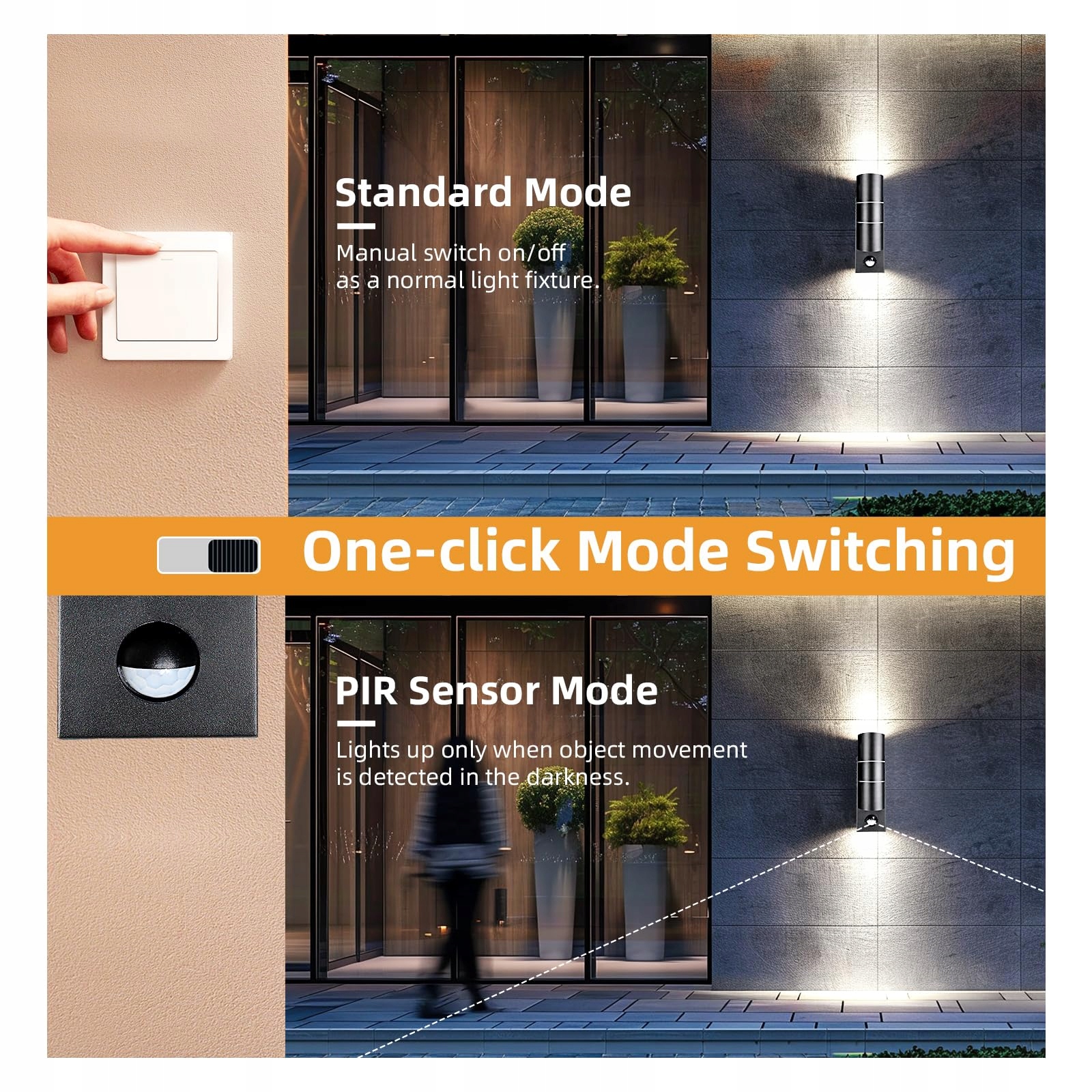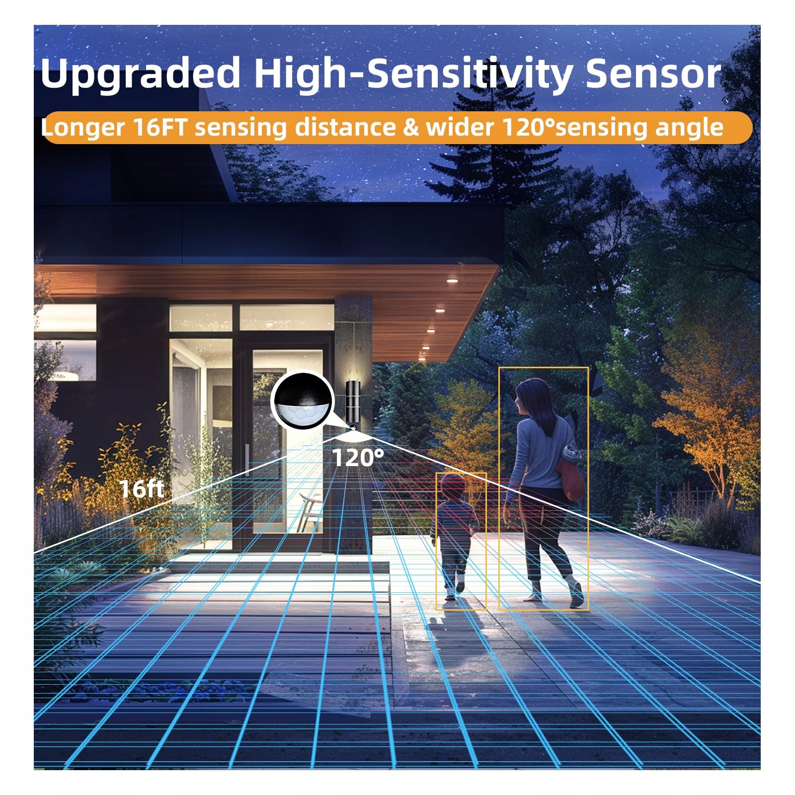 【Inteligentne lampy zewnętrzne z elastycznością trybu podwójnego】Wysokoczuły czujnik ruchu i światła z kątem widzenia 120° i zasięgiem 5 m. Automatyczne świecenie przez 60 sekund, wyzwalane ruchem przy słabym oświetleniu (<20-25 luksów), dla optymalnego bezpieczeństwa.
