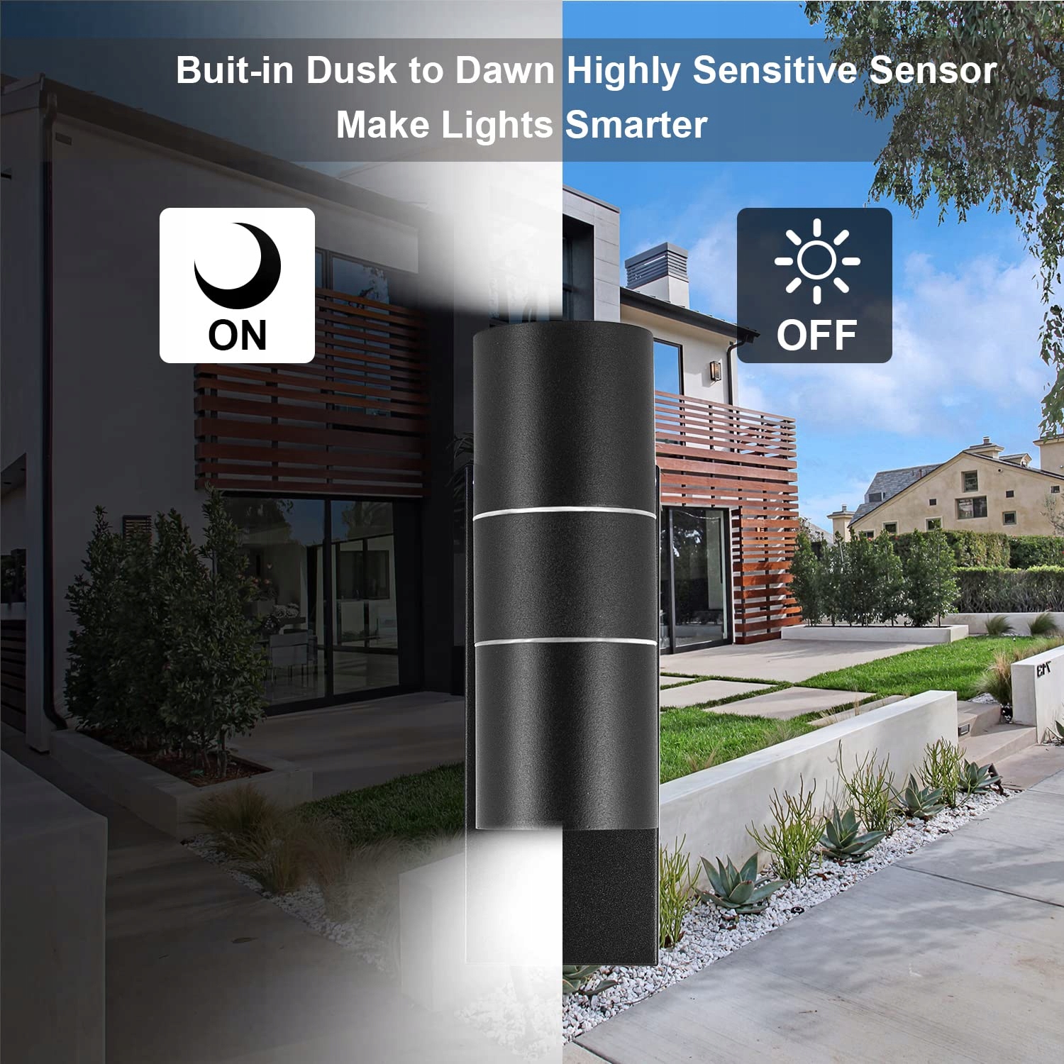 【Czuły czujnik zmierzchu】Ta zewnętrzna lampa ścienna wyposażona jest w wbudowany czujnik zmierzchu. Lampa może się automatycznie włączać nocą i wyłączać w ciągu dnia. Czuły czujnik nie wymaga ręcznego włączania, co sprawia, że obsługa jest prosta i efektywna.