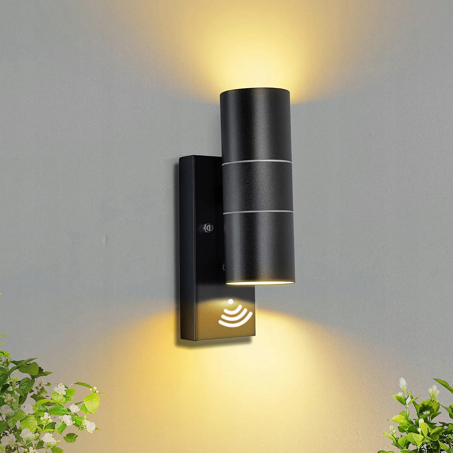 Unikcst LED Lampa ścienna z czujnikiem zmierzchu na zewnątrz Up Down z czujnikiem światła IP44 Lampa zewnętrzna czarna w zestawie z 2x 5W GU10 ciepła biała żarówka, 1 sztuka