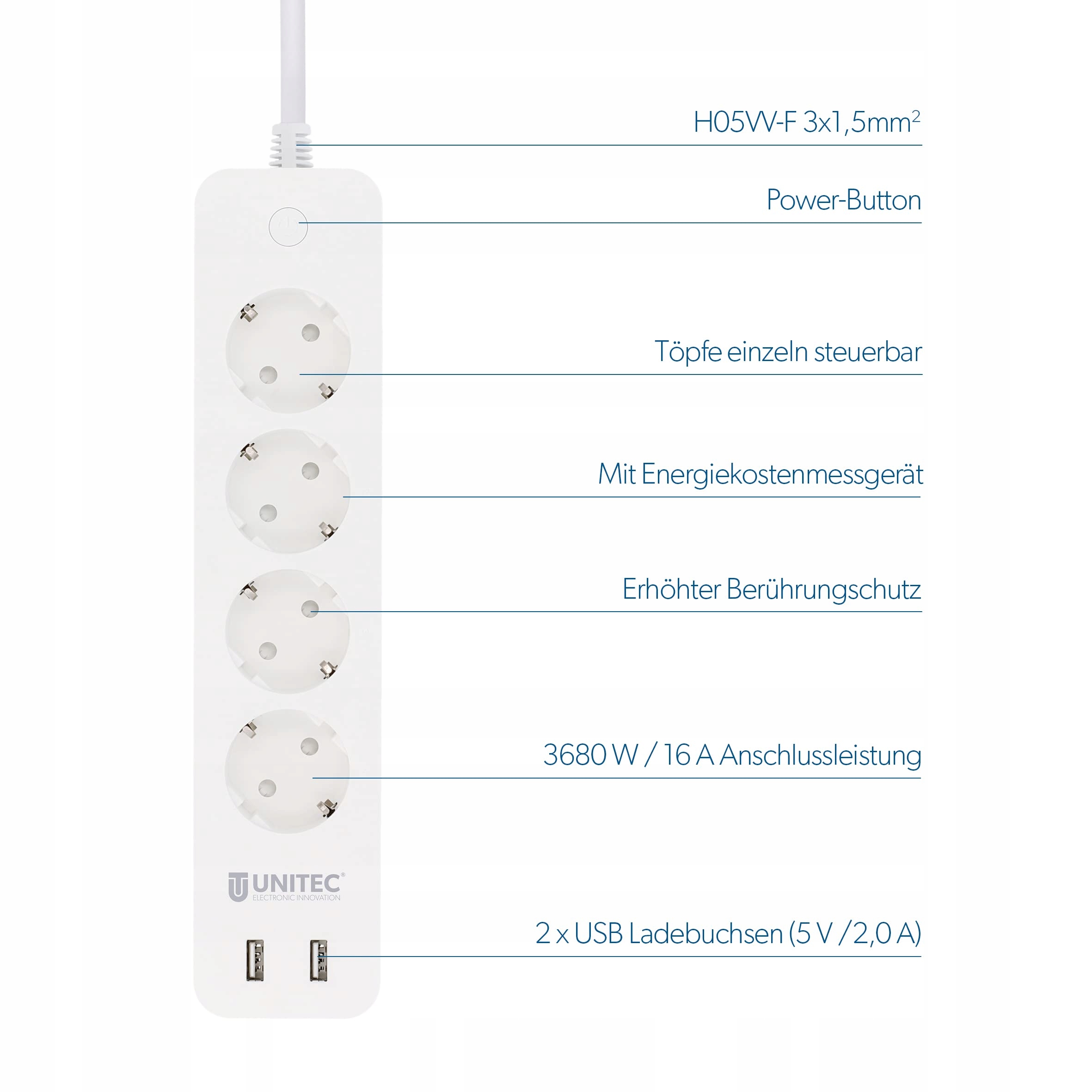 UNITEC Listwa Zasilająca WiFi 4x2 Gniazda Smart z USB i Pomiarem Energii | Premium Supply