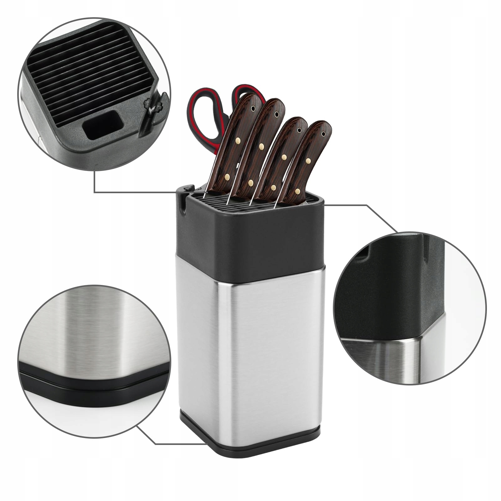 Doskonale cechy: stalowy stojak na noże z pustym, ociekającym designem u dołu, mocno przylega do blatu, zapobiega ślizganiu się, przesuwaniu i innym zjawiskom, skutecznie zapobiega niepotrzebnym niebezpieczeństwom.