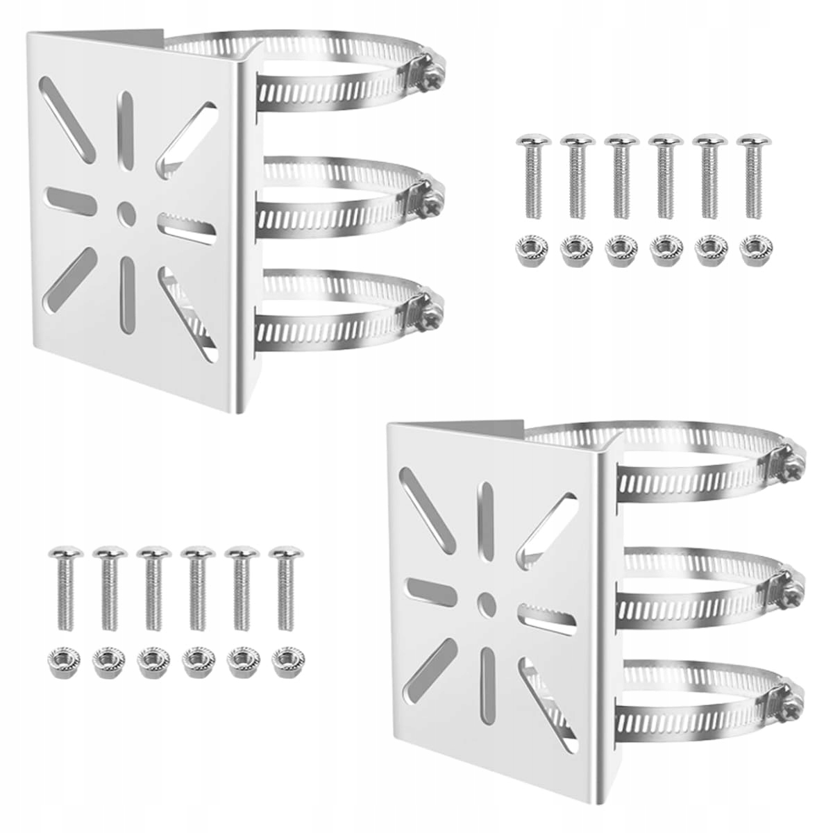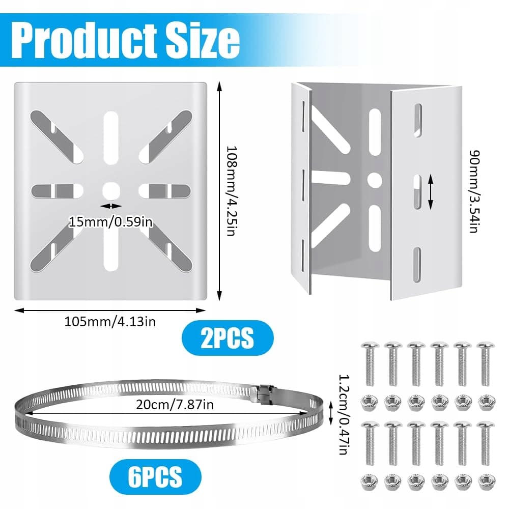 Uchwyt masztowy do kamery monitoringu: 2 sztuki uchwytów masztowych do kamery monitoringu, pionowy uchwyt na słup (10,5 x 10,8 cm) kompletny z 6 regulowanymi pierścieniami, 12 śrubami, 12 nakrętkami oraz wszystkimi narzędziami – kompletne rozwiązanie dla wszystkich wymagań instalacyjnych.