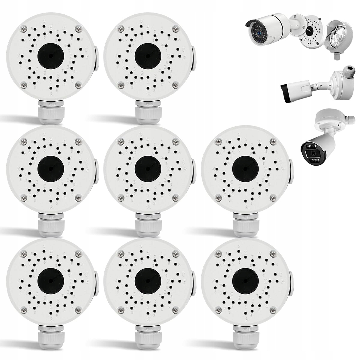 {Nowy design, ulepszone funkcje} Strona puszki rozgałęźnej posiada standardowej wielkości przyłącze kablowe z uszczelką silikonową, mocowania gwintowane dla łatwej wodoodporności oraz odporną na deszcz blokadę. Dodatkowe otwory montażowe zapewniają miejsce dla niemal wszystkich typów kamer. Nowe wymiary produktu: okrągła średnica zewnętrzna około 10,35 centymetra, średnica otworu środkowego około 3 centymetry oraz wysokość około 4,92 centymetra. Podkreślenie: Ten produkt jest wyraźnie zaprojektowany do użytku z kamerami bullet i nie jest przeznaczony do stosowania z kamerami kopułkowymi.