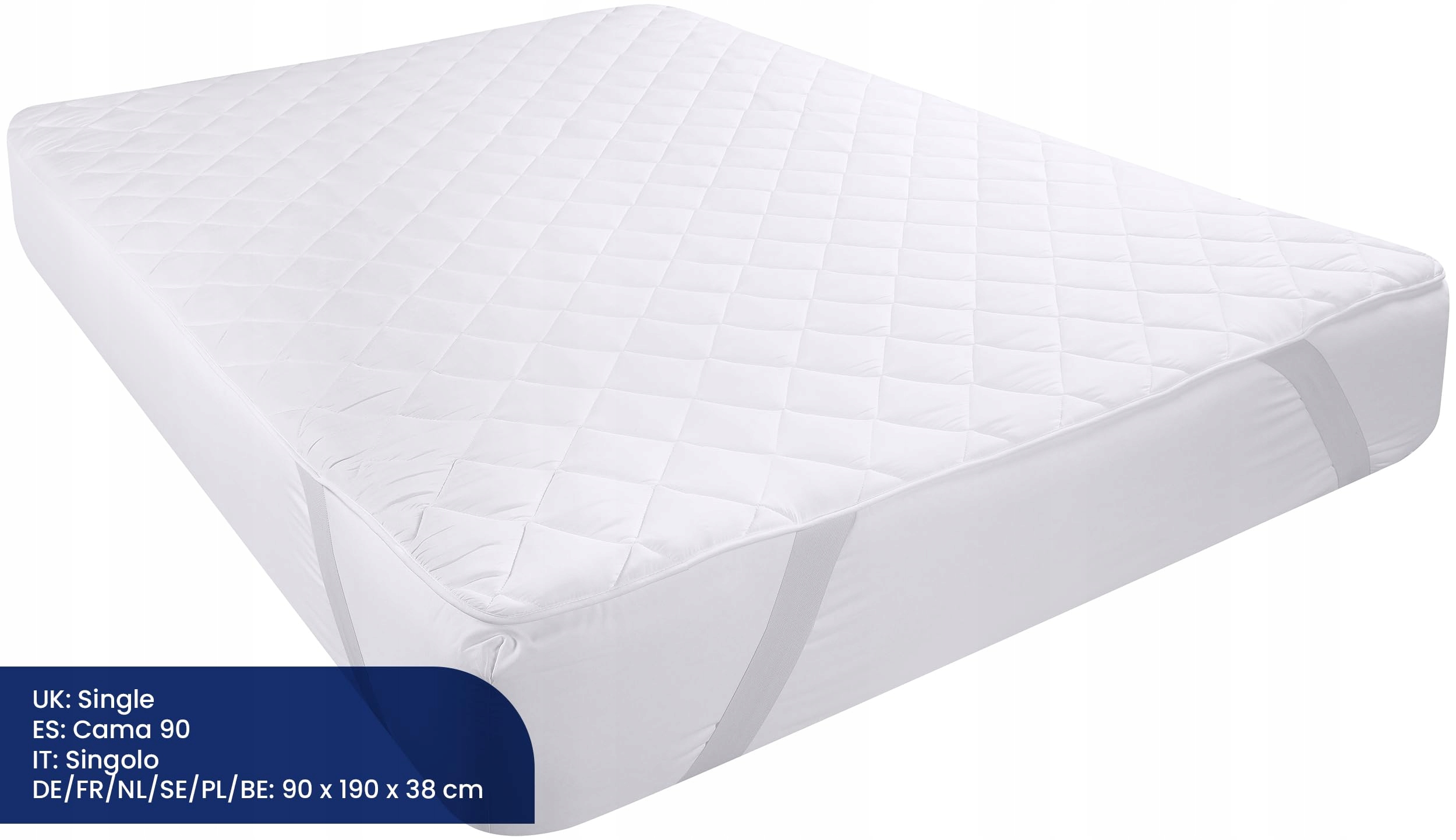 Rozmiar i dopasowanie - Pikowany ochraniacz na materac ma rozmiar 90 x 190 cm; elastyczna taśma rozciąga się do materaca o głębokości 38 cm (NIE WODOODPORNY)