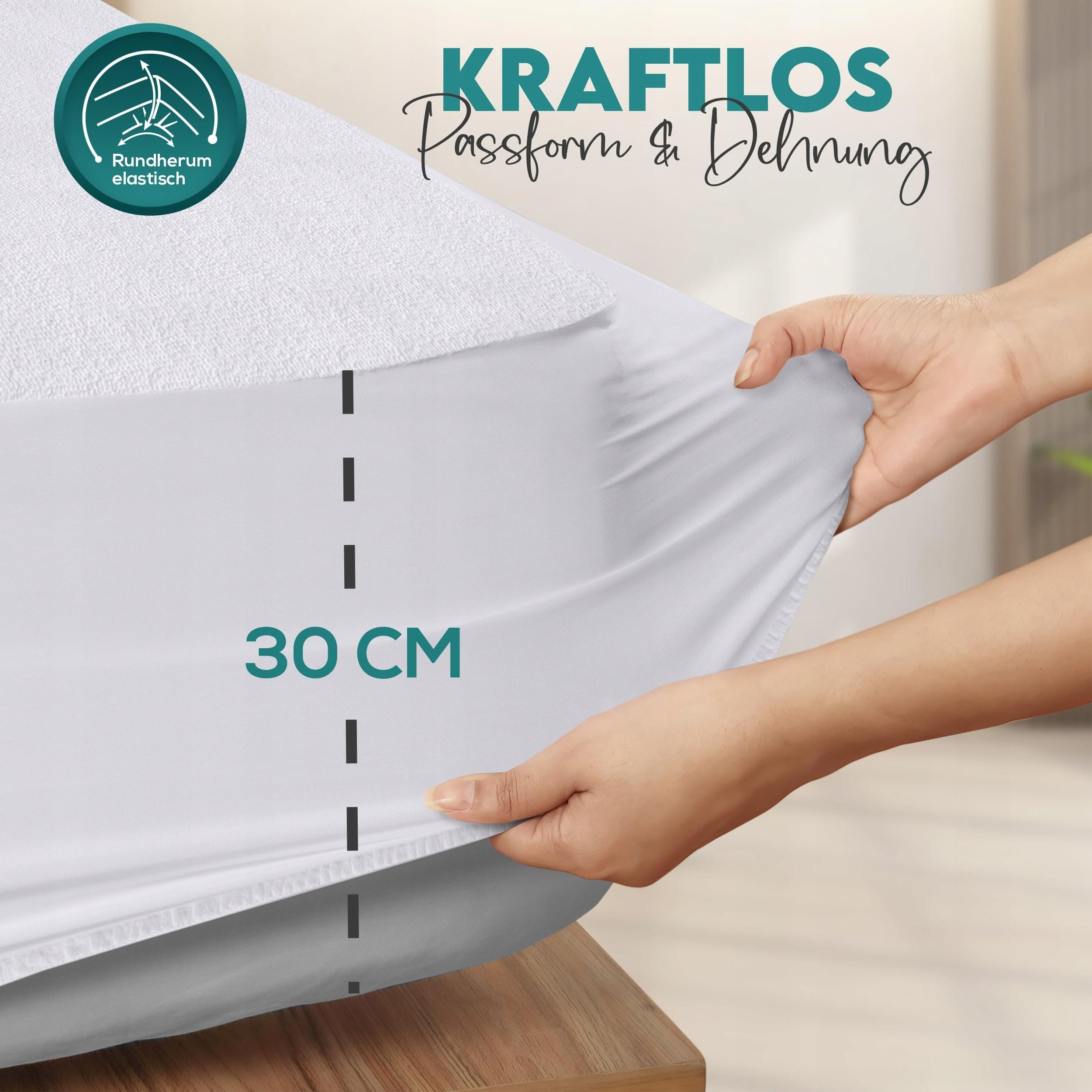 Design frotte: Ochrona materaca idealnie pasuje na łóżka o wymiarach 160 x 200 cm i ma głębokość do 30 cm, z profesjonalnie złożonymi szwami i głęboko osadzonymi kieszeniami.