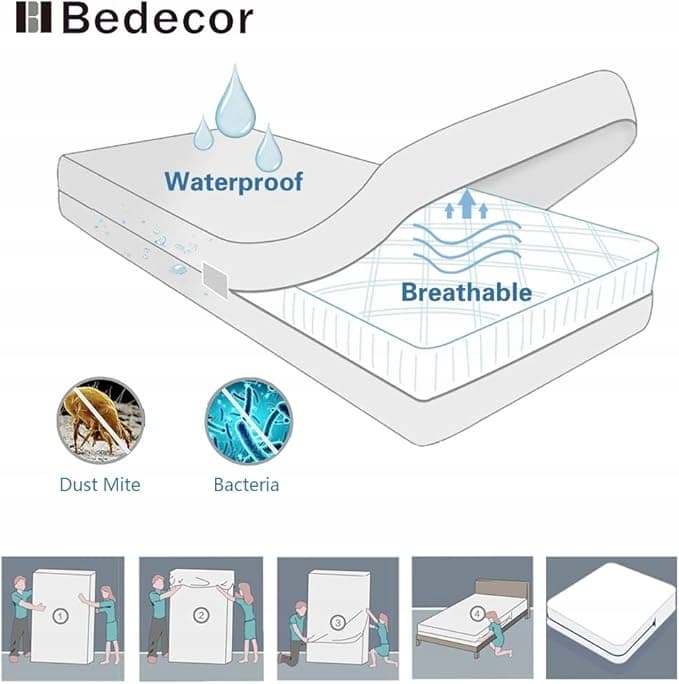 100% Wodoodporna: Powierzchnia wodoodporna 200 g/m² i wysokiej jakości konstrukcja szwów zapobiegają wnikaniu wody i moczu; utrzymuje Twój materac suchym i wolnym od plam