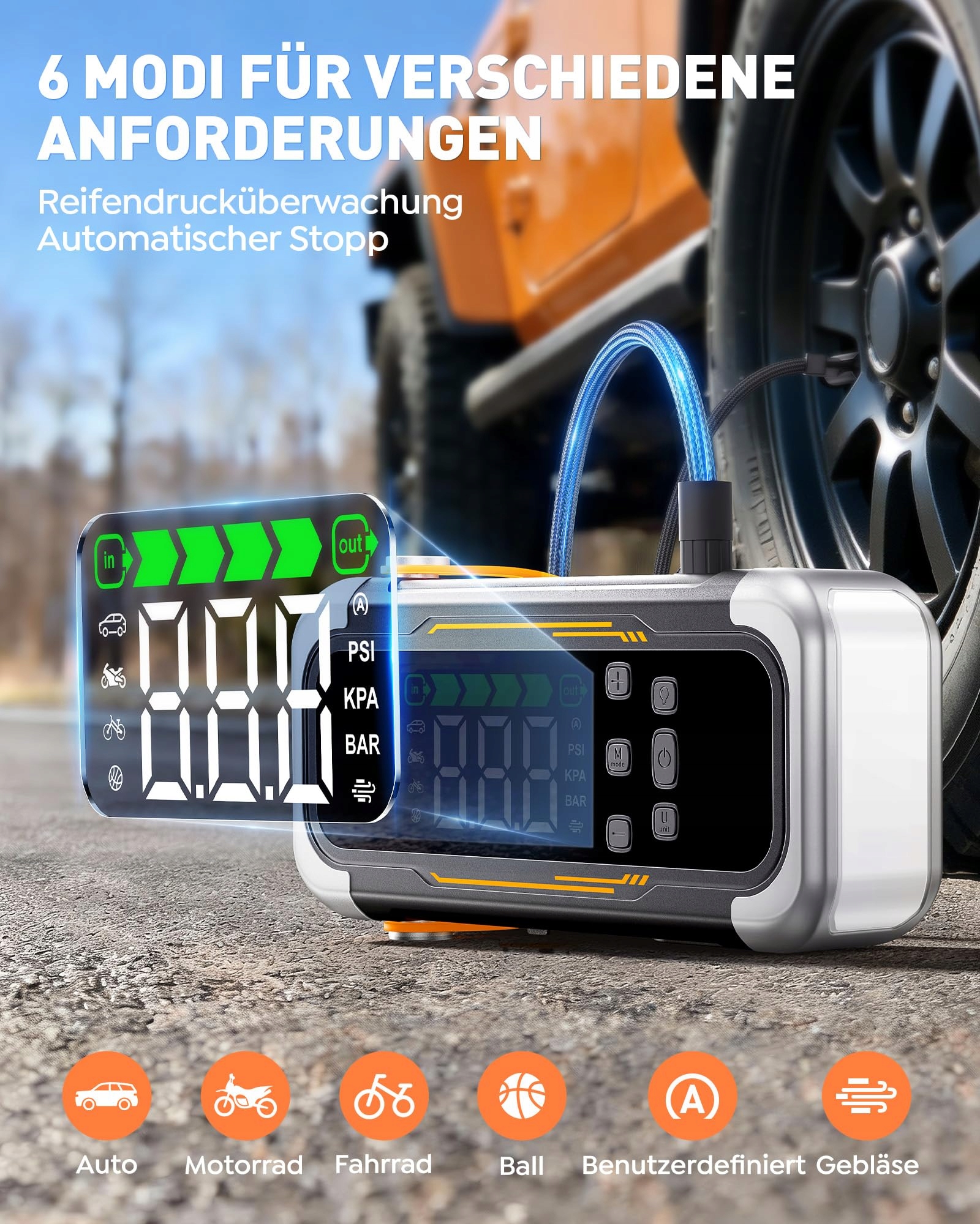 ⚒️【Inteligentny kompresor powietrza】Powerbank rozruchowy jest wyposażony w inteligentny kompresor. W trybie niestandardowym osiąga do 150 PSI, wspiera monitorowanie ciśnienia w oponach w czasie rzeczywistym i automatycznie zatrzymuje się po pełnym napompowaniu, aby uniknąć przeładowania. Rozrusznik samochodowy obsługuje 6 trybów pompowania i 3 jednostki ciśnienia (PSI / BAR / KPA). W zestawie 4 końcówki wentylowe do szybkiego pompowania opon, piłek, kołnierzy do pływania i wielu innych.