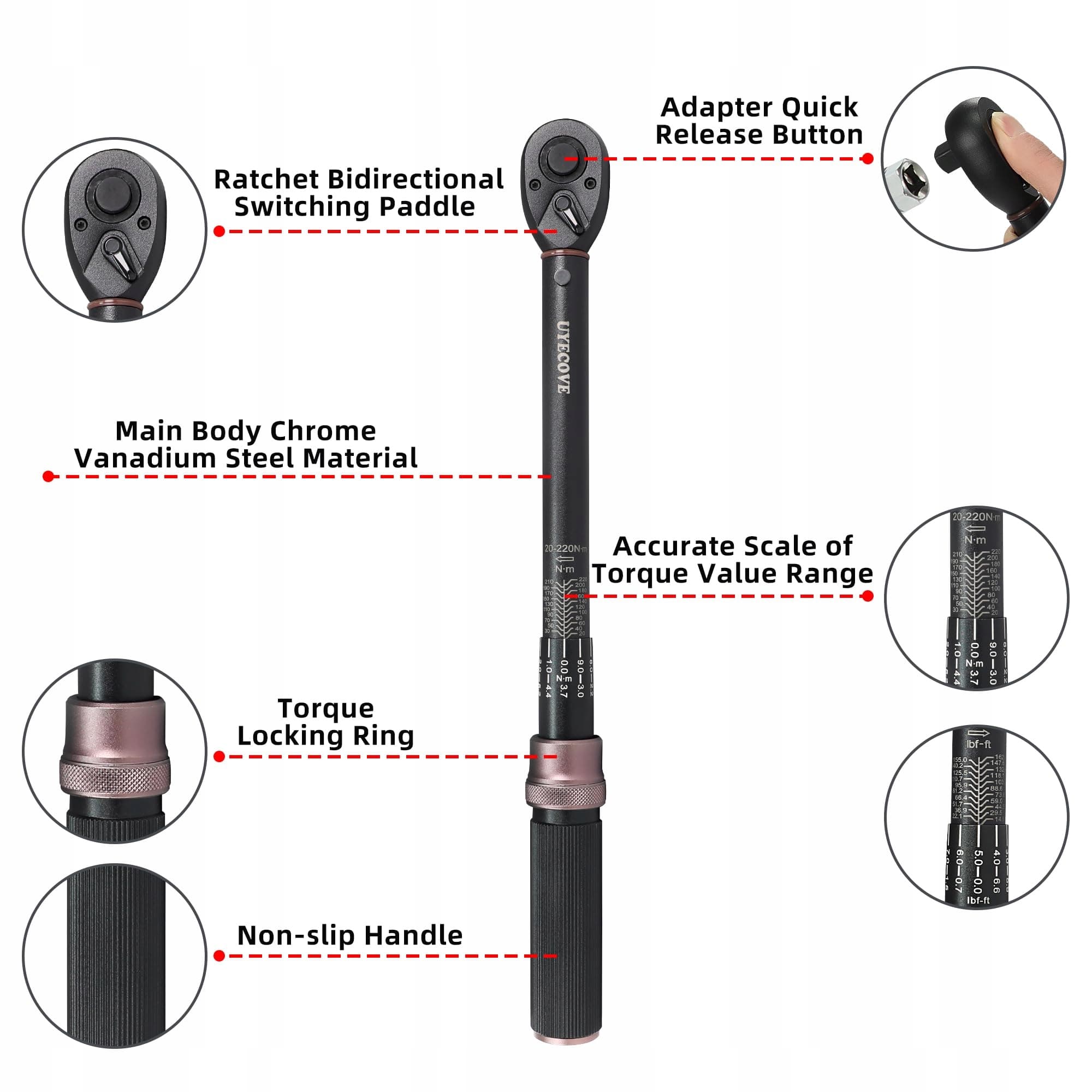 UYECOVE Klucz Dynamometryczny 1/2" 20-220Nm Zestaw Do Aut i Motocykli