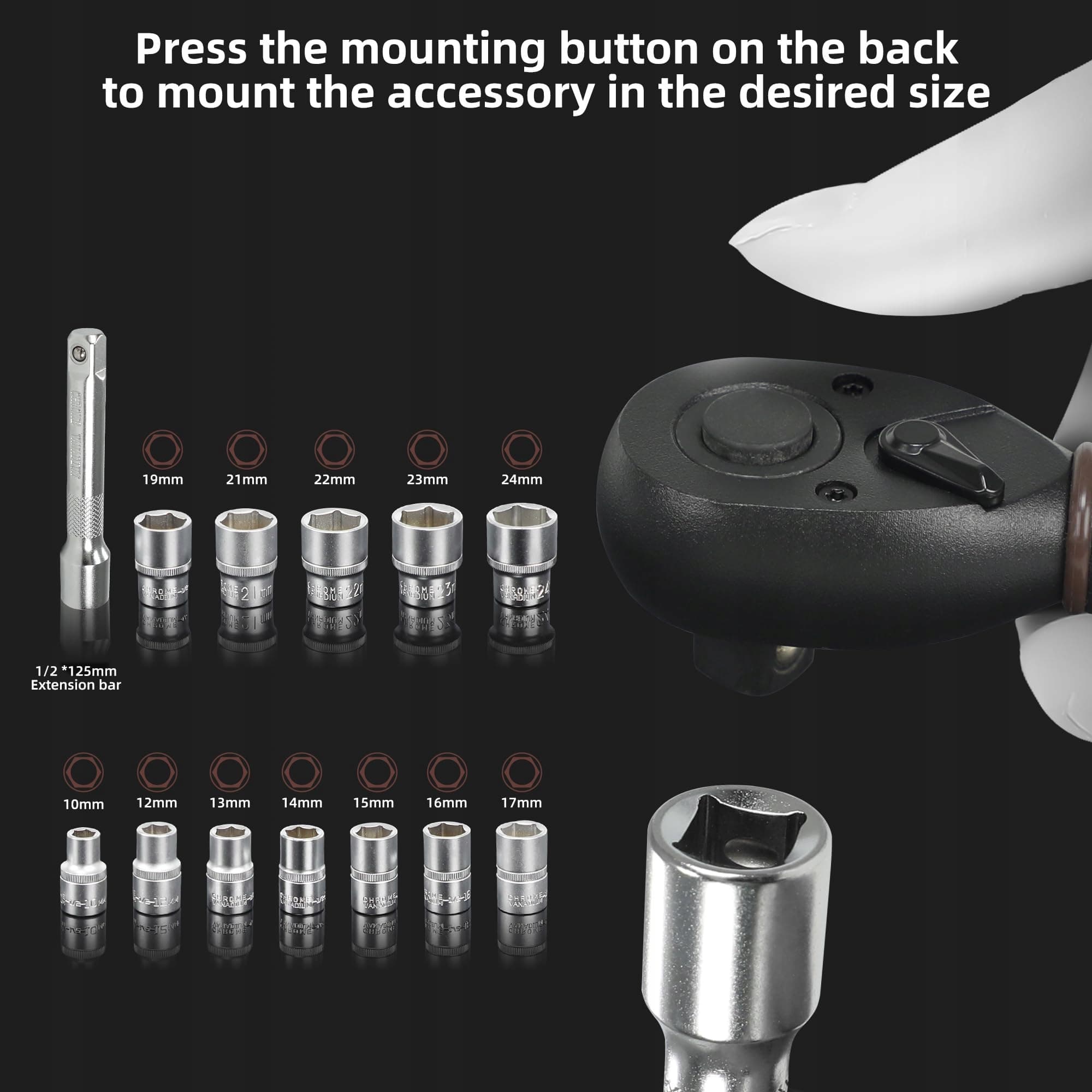 Zestaw kluczy dynamometrycznych 14szt: Zawiera 1x1/2' klucz dynamometryczny, 1x1/2' przedłużkę (125mm), 12-częściowe nasadki: 10mm 12mm 13mm 14mm 15mm 16mm 17mm 19mm 21mm 22mm 23mm 24mm w stabilnej plastikowej walizce do przechowywania i transportu. Szeroko stosowany do urządzeń instalacyjnych, montażu produktów, elektrotechniki, projektów DIY, konserwacji motocykli, samochodów i ciężarówek.