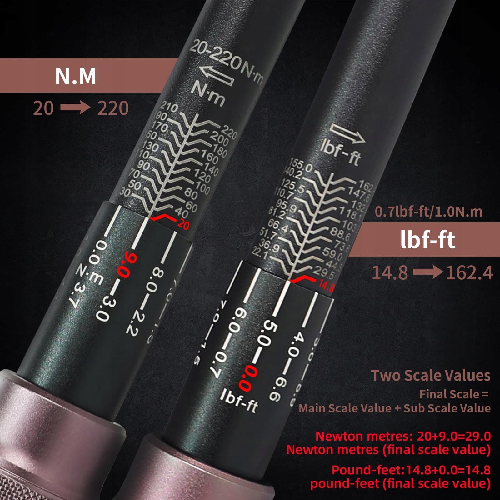 Łatwy w użyciu: Zestaw kluczy dynamometrycznych do samochodu Naciśnij przycisk blokady w dół i trzymaj go, aż ustawienie momentu obrotowego zostanie zakończone. Puść rękę, a pierścień blokujący automatycznie wróci i zablokuje. Skala uchwytu wykorzystuje technologię laserową, podwójna skala jest wyraźna i łatwa do odczytania, nie zużywa się łatwo.