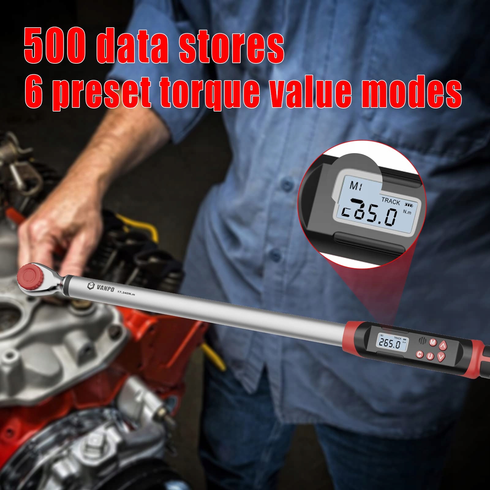 VANPO Cyfrowy klucz dynamometryczny 1/2 cala do samochodów i motocykli, zestaw kluczy dynamometrycznych 17-340 Nm z wstępnie ustawioną pamięcią, sygnalizatorem dźwiękowym i wyświetlaczem LED, ± 2% dokładności błędu