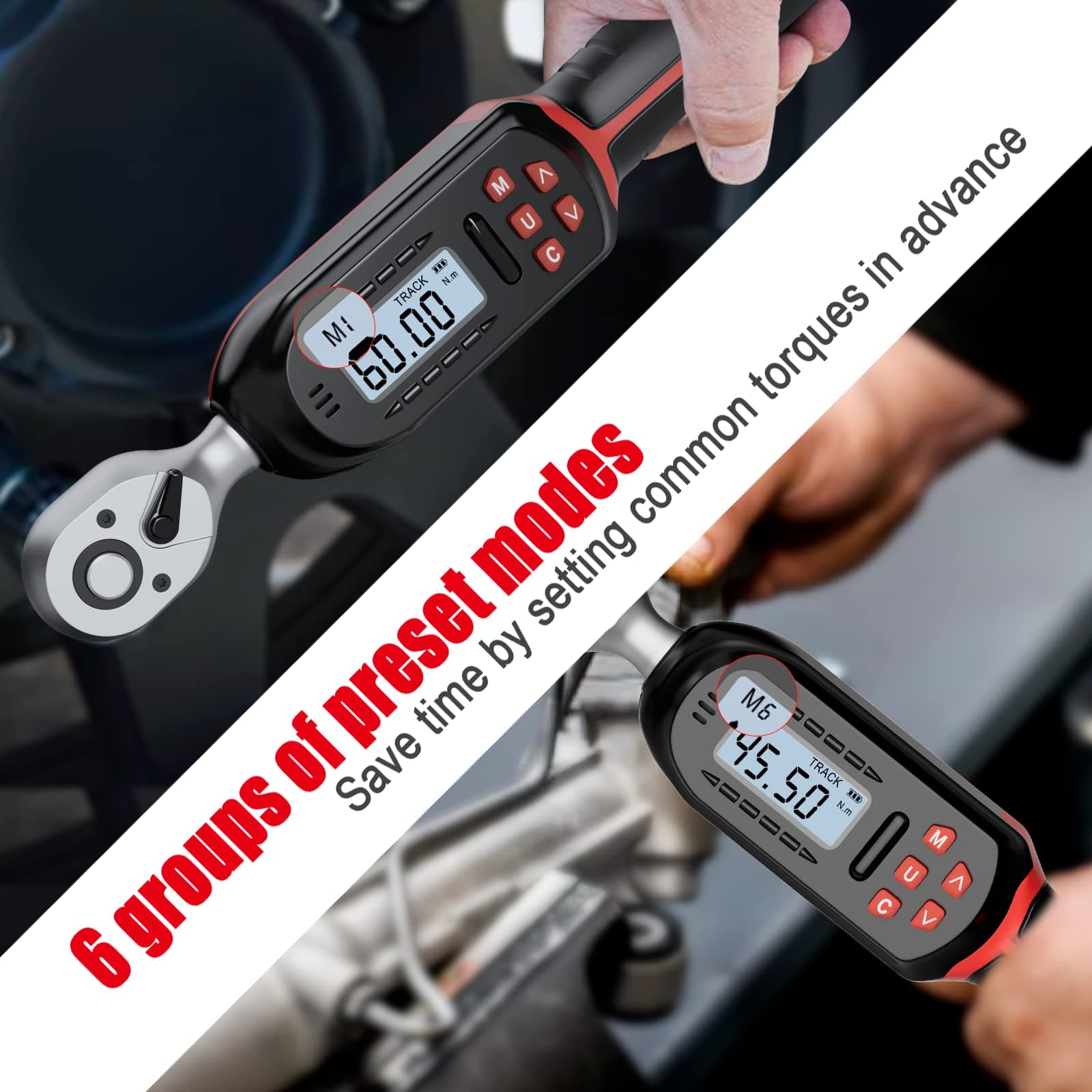 【Wstępnie ustawiony tryb】(Ulepszony) Ten cyfrowy klucz dynamometryczny dodaje 6 zestawów wstępnie ustawionych wartości. Możesz ustawić stałą wspólną wartość momentu obrotowego w każdym przedziale, co jest również bardzo praktyczne, gdy musisz przełączyć się na sąsiednią wartość. Krótki rozmiar może być używany w małych przestrzeniach. Co może być używane w scenach rowerowych i motocyklowych.
