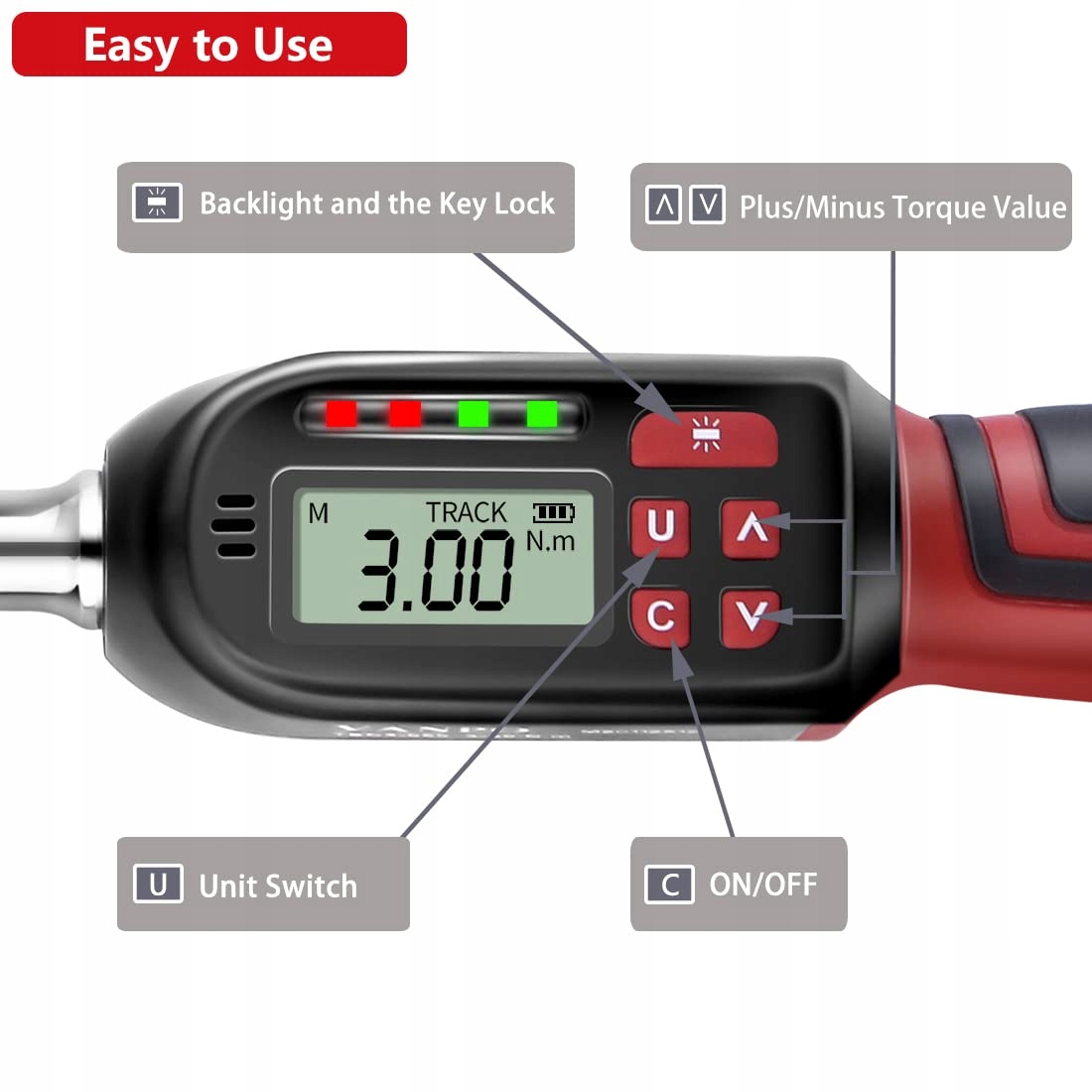 【Zaawansowany wyświetlacz LCD】Ten cyfrowy klucz dynamometryczny wyposażony jest w zaawansowany wyświetlacz LCD, który wyświetla wartości w kg-cm, Nm, in-lb, ft-lb. Wyświetlacz z wysokim podświetleniem może być używany w ciemnych warunkach i jest również doskonały do odczytu i użycia przez początkujących.