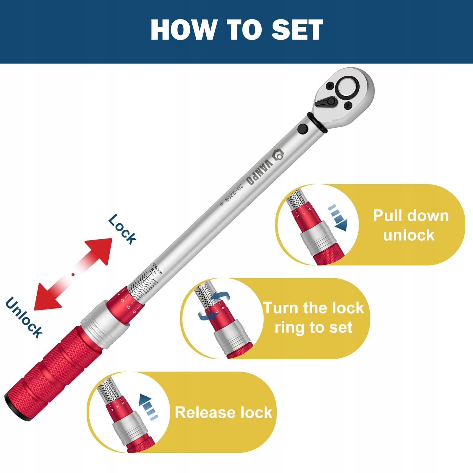【Łatwy do ustawienia】Najpierw pociągnij przycisk blokady w dół, przytrzymaj go i następnie rozpocznij ustawianie żądanej wartości momentu obrotowego. Puść rękę, a przycisk blokady automatycznie wróci, aby zablokować wartość momentu obrotowego. Gdy go nie używasz, ustaw klucz dynamometryczny 3/8 na minimalną wartość momentu obrotowego.
