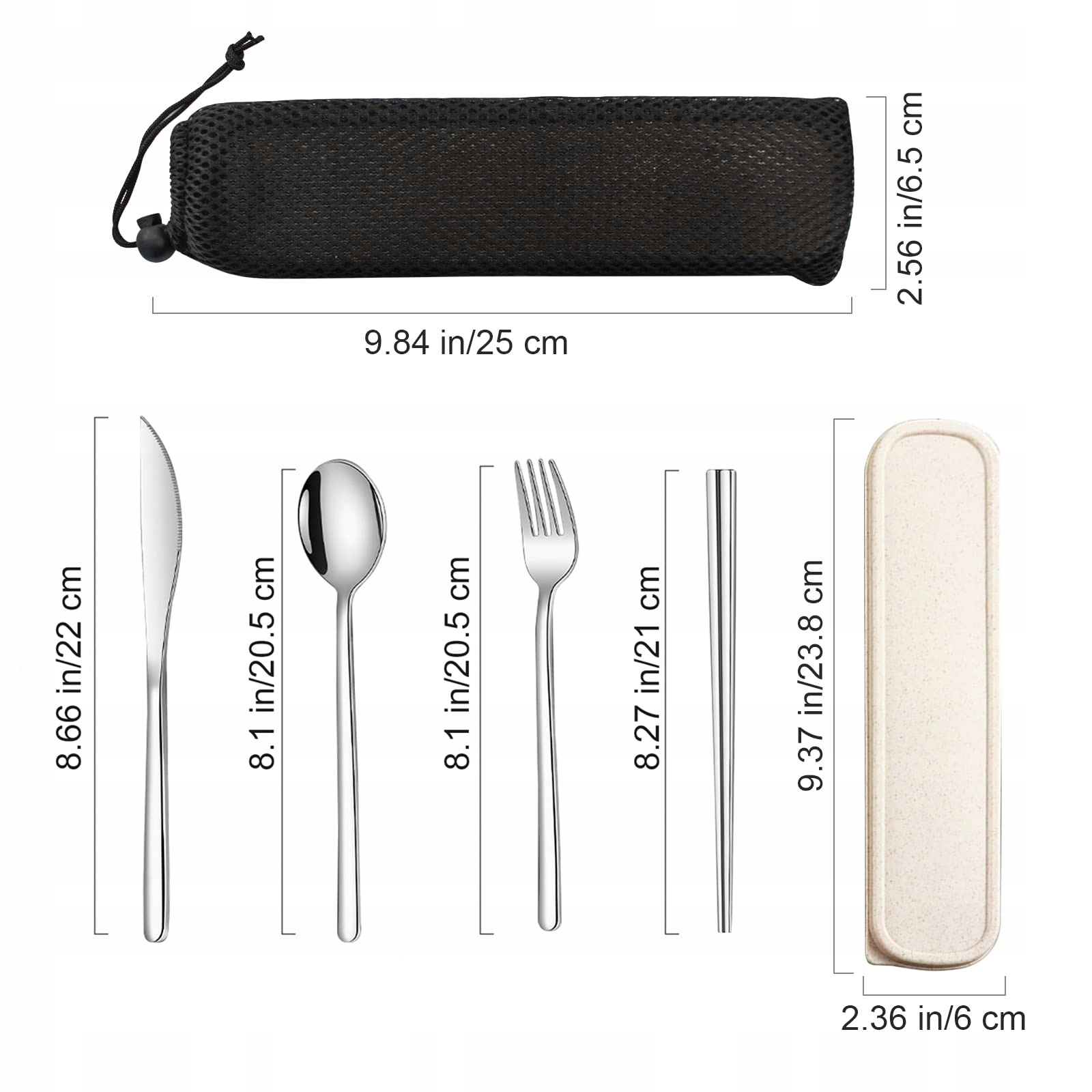 🍴[Oszczędność miejsca] Nóż, łyżka, widelec i pałeczki mogą być oszczędnie ułożone w torbie transportowej. Zestaw naczyń podróżnych idealnie mieści się w Twojej torbie, torebce lub lunchbagu z woreczkiem ochronnym i pudełkiem do przechowywania.