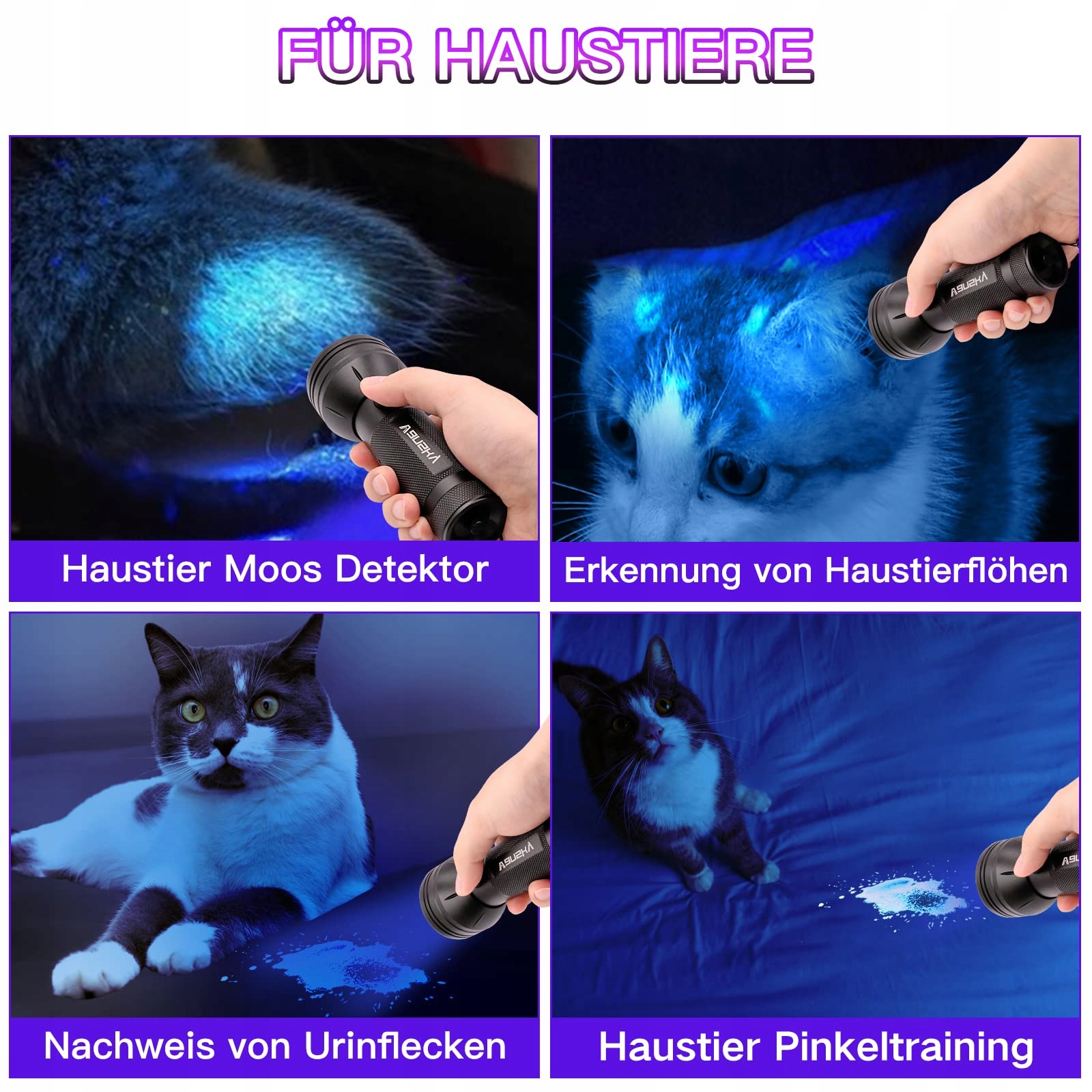 【Czyszczenie domowe i wykrywanie plam z moczu】Ta lampa UV uwidacznia kota i psa oraz ukryte zabrudzenia, których nie widać gołym okiem. Dywany, sofy czy materace można szybko zlokalizować, co sprawia, że sprzątanie jest dokładniejsze i łatwiejsze. Idealna do sypialni, salonu i miejsc dla zwierząt – lampa UV jest szczególnie skuteczna w ciemności lub przy słabym oświetleniu.