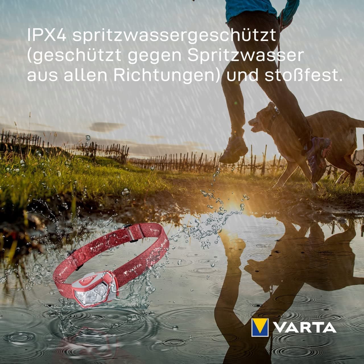 Latarka czołowa VARTA LED z 3x bateriami AAA, latarka do sportów na świeżym powietrzu H20 Pro, trzy tryby świecenia, odporna na zachlapania, funkcja ściemniania, z obrotową głowicą, czerwona