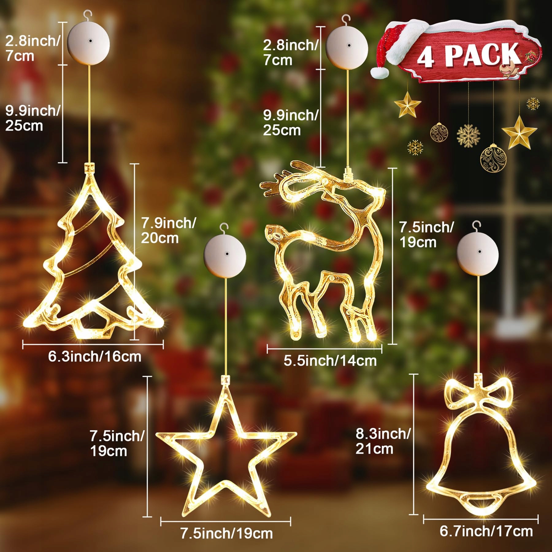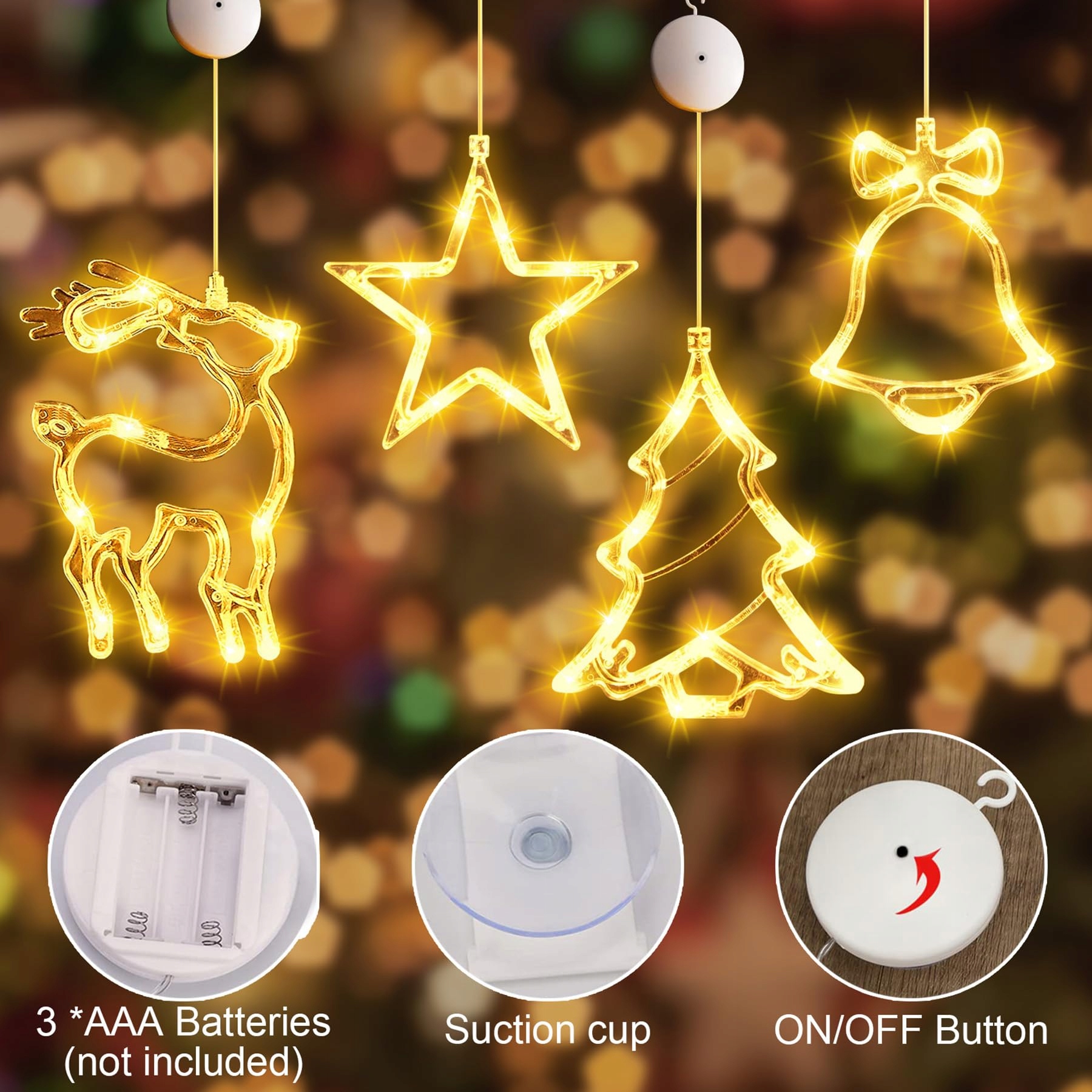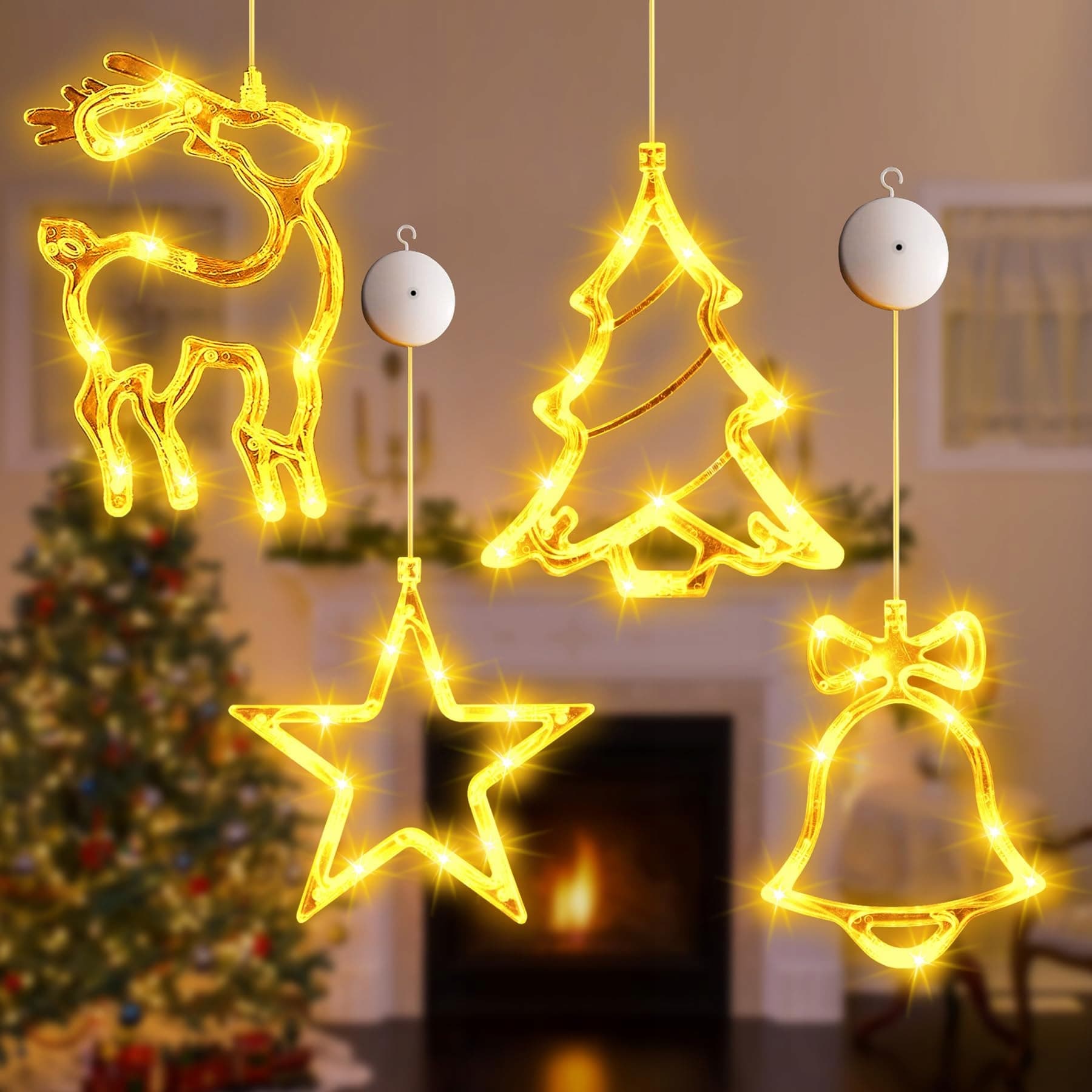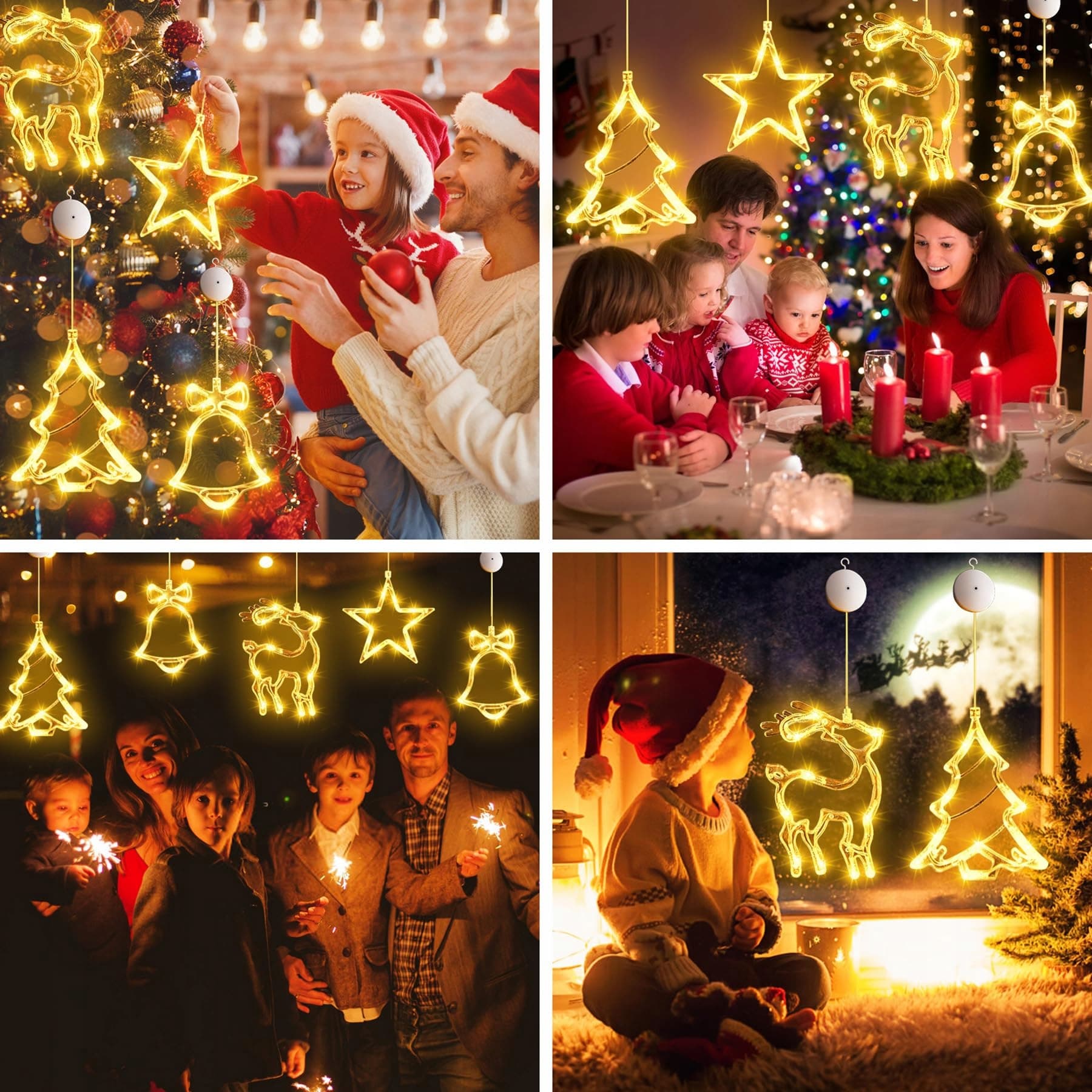 🌟[ŁAŃCUCH ŚWIETLNY NA OKNO NA BOŻE NARODZENIE]Otrzymasz ciepłobiałe łańcuchy świetlne na okno na Boże Narodzenie w 4 stylach, w tym gwiazdy, renifery, choinki i dzwonki. Idealny łańcuch świetlny na okno na Boże Narodzenie, łańcuch świetlny na okno na Boże Narodzenie i rozświetli Twoje salon, pokój dziecięcy lub witrynę. Zasłona świetlna na okno na Boże Narodzenie dodaje radosnej atmosfery każdemu miejscu.