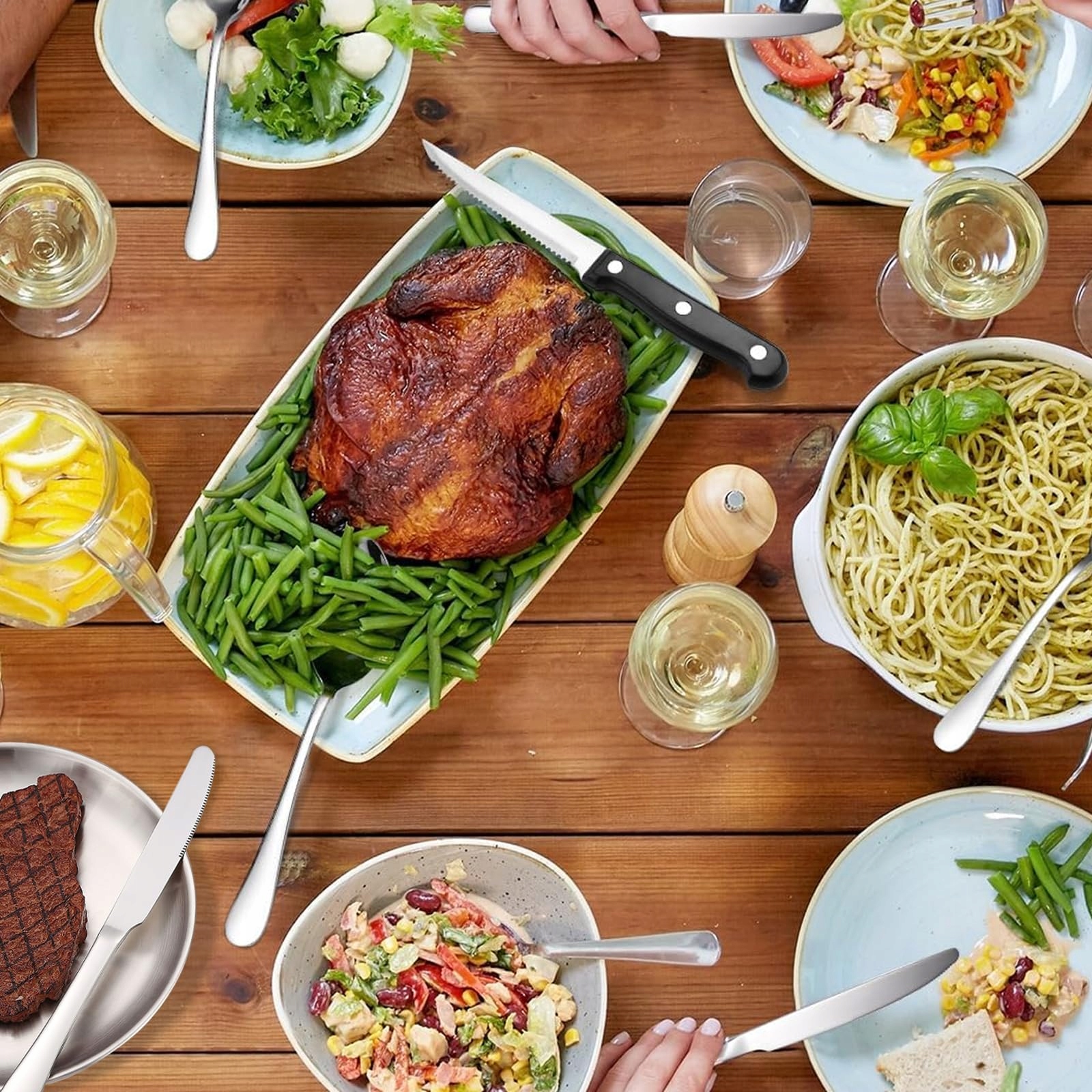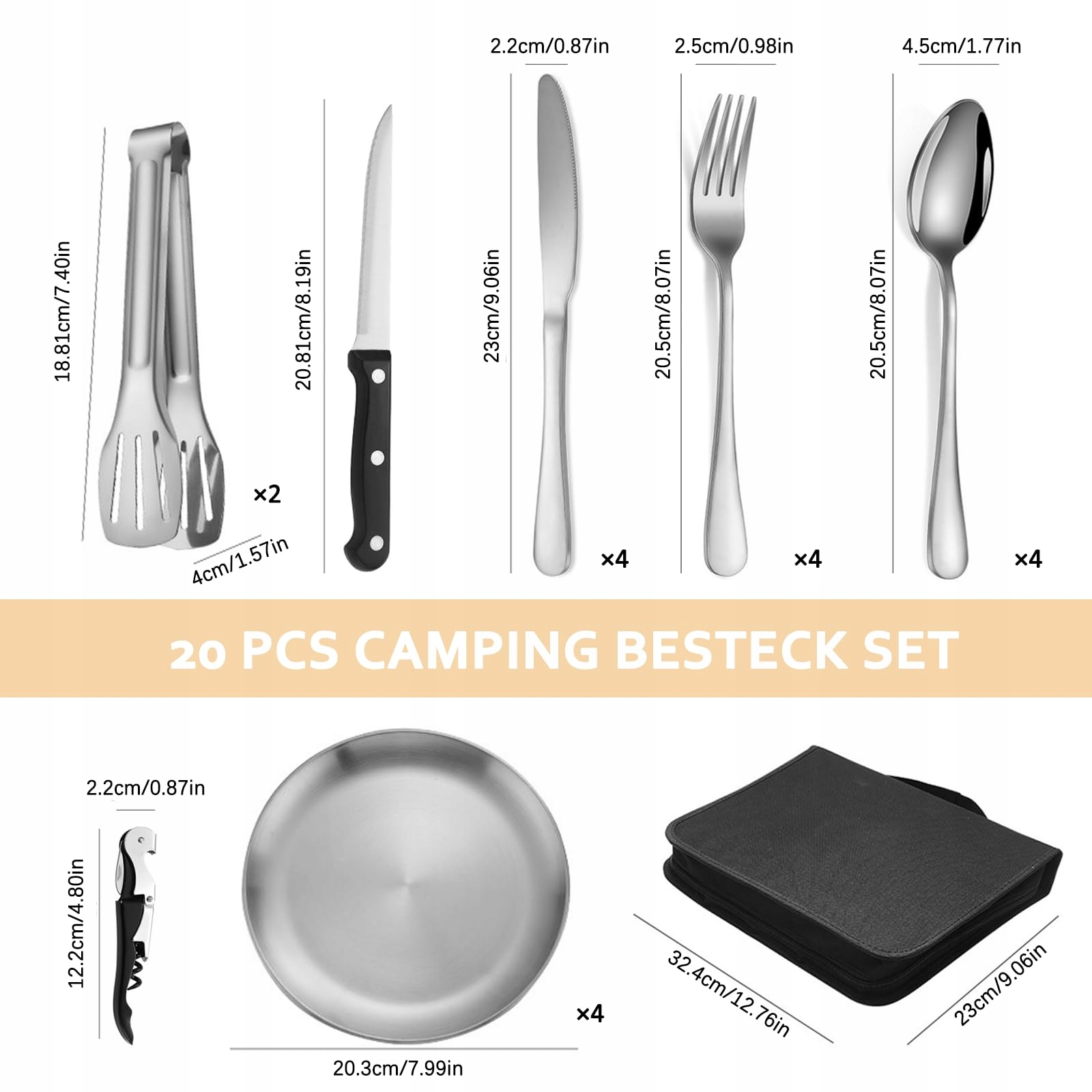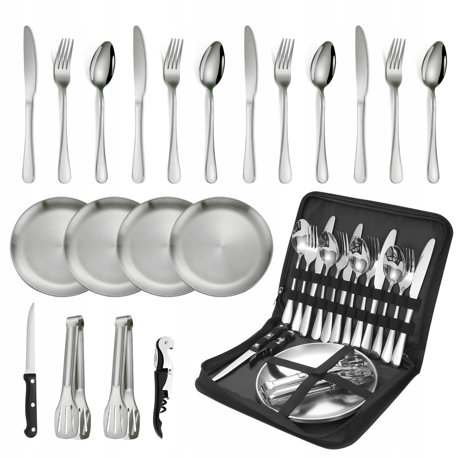 Zestaw naczyń kempingowych: Nasz zestaw sztućców kempingowych zawiera 4 widelce, 4 łyżki, 4 noże stołowe, 1 nóż do masła, 4 stalowe talerze (8 cali), 2 klipsy do steków, 1 otwieracz do butelek oraz 1 przenośną torbę do przechowywania. Idealny na kemping lub piknik z partnerem lub przyjaciółmi