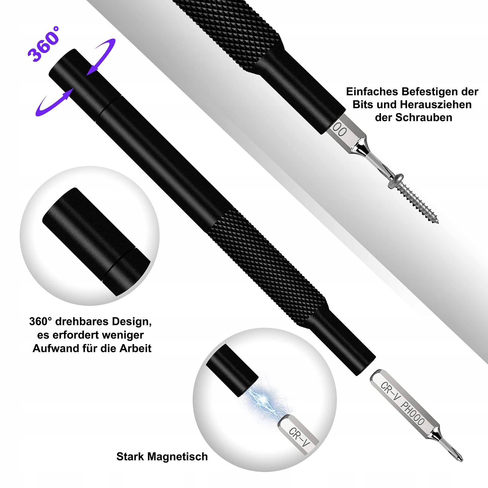 OBROTOWY I MAGNETYCZNY UCHWYT: Uchwyt z aluminium z obrotową końcówką o 360 stopni umożliwia łatwe wciskanie i dokręcanie/odkręcanie. Specjalna antypoślizgowa matowa powierzchnia i żłobiona powierzchnia zapewniają wygodny chwyt. Anodowanie powierzchni piaskowanej zapewnia ochronę przed spawaniem i korozją. Magnetyczny design zapewnia stabilne trzymanie bitów wkrętaków, aby zapobiec ich wypadaniu i ułatwić usuwanie śrub.