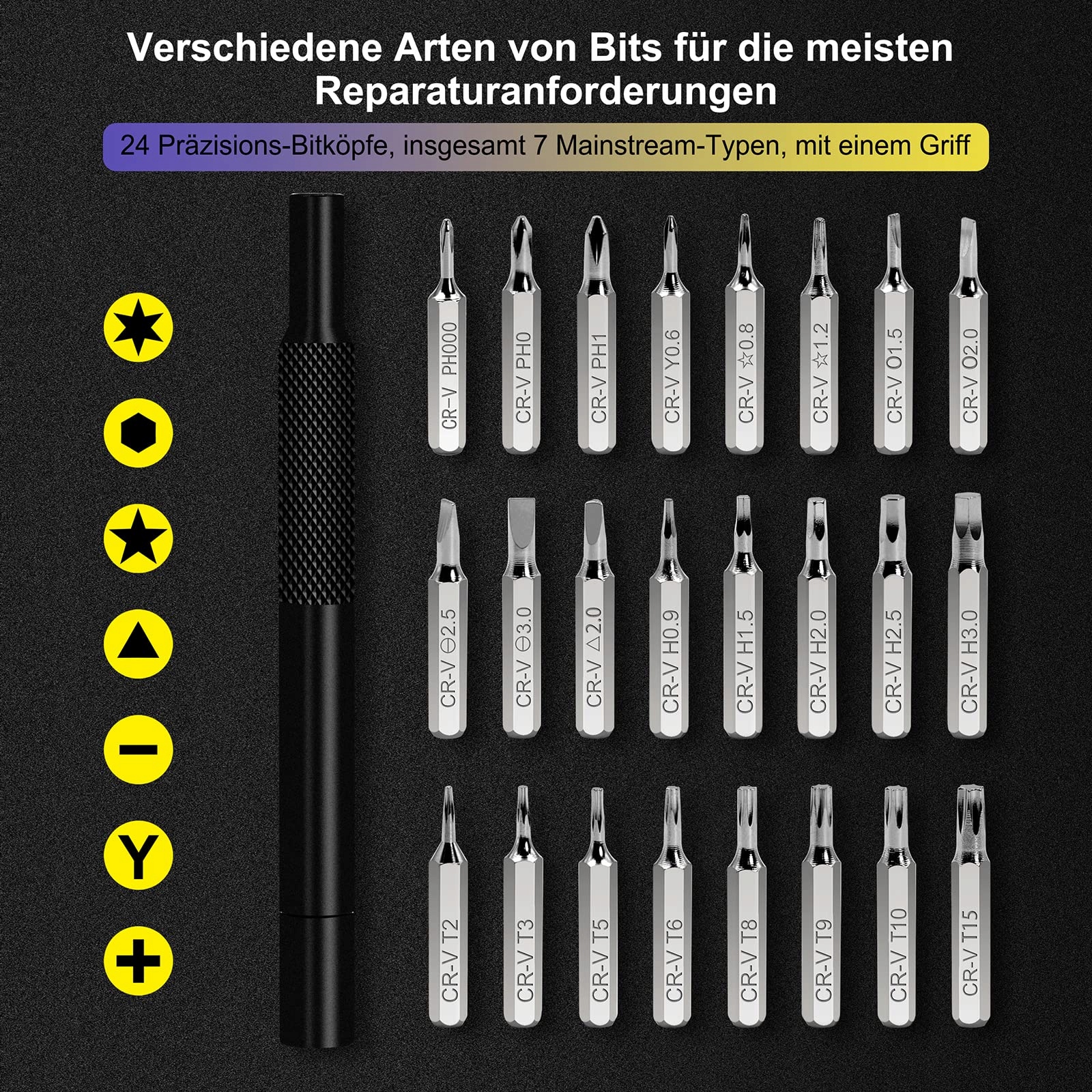 WIELE ZASTOSOWAŃ: Zestaw narzędzi precyzyjnych zawiera 7 różnych rodzajów popularnych wykonania. Torx T2 T3 T5 T6 T8 T9 T10 T15, PH000, PH0, PH1, Y0.6, SL2.5, SL3.0, H0.9, H1.5, H2.0, H2.5, H3.0, ☆0.8,☆1.2, o1.5, o2.0, △2.0. Potrzebujesz tylko tego zestawu do demontażu i konserwacji różnych urządzeń, takich jak telefony, zegarki, okulary, aparaty, komputery, konsole do gier, drony itp. Odpowiedni do profesjonalnych napraw, prac majsterkowicza i innych celów.