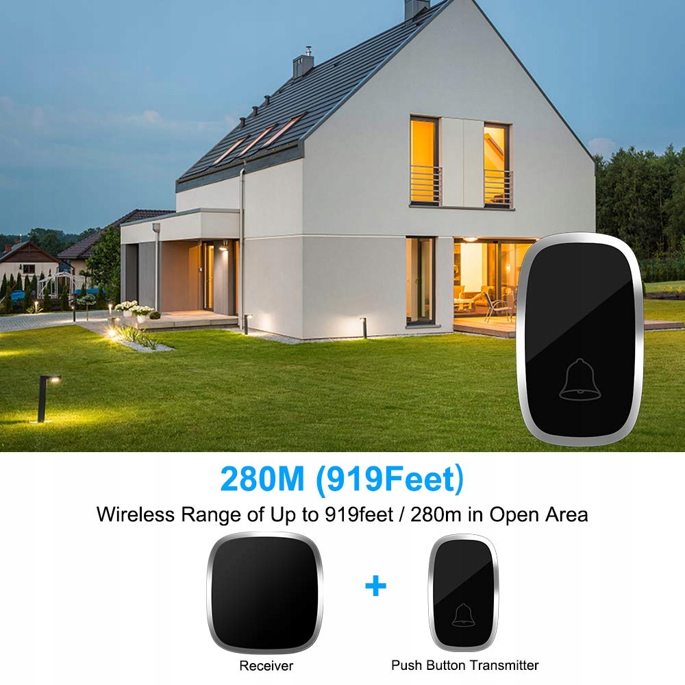 【300M Bezprzewodowy Zasięg】Dzwonek bezprzewodowy na zewnątrz wodoodporny, Zasięg do 300m na otwartej przestrzeni. Z ścianą domu i drzwiami oraz oknami, co jednak powinno być wystarczające. Ten dzwonek do drzwi może być używany w willach, mieszkaniach, biurach, ogrodach lub pomieszczeniach handlowych.