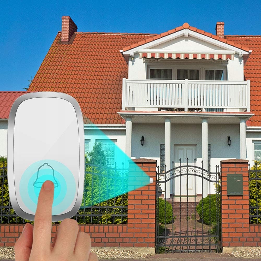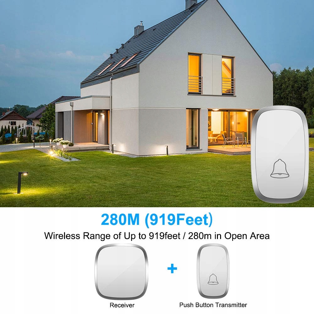 【300M Zasięg bezprzewodowy】Dzwonek bezprzewodowy na zewnątrz wodoodporny, do 300m zasięgu na otwartej przestrzeni. Z ścianą domu i drzwiami oraz oknami, co jednak powinno być wystarczające. Ten dzwonek do drzwi można używać w willach, mieszkaniach, biurach, ogrodach lub pomieszczeniach handlowych.