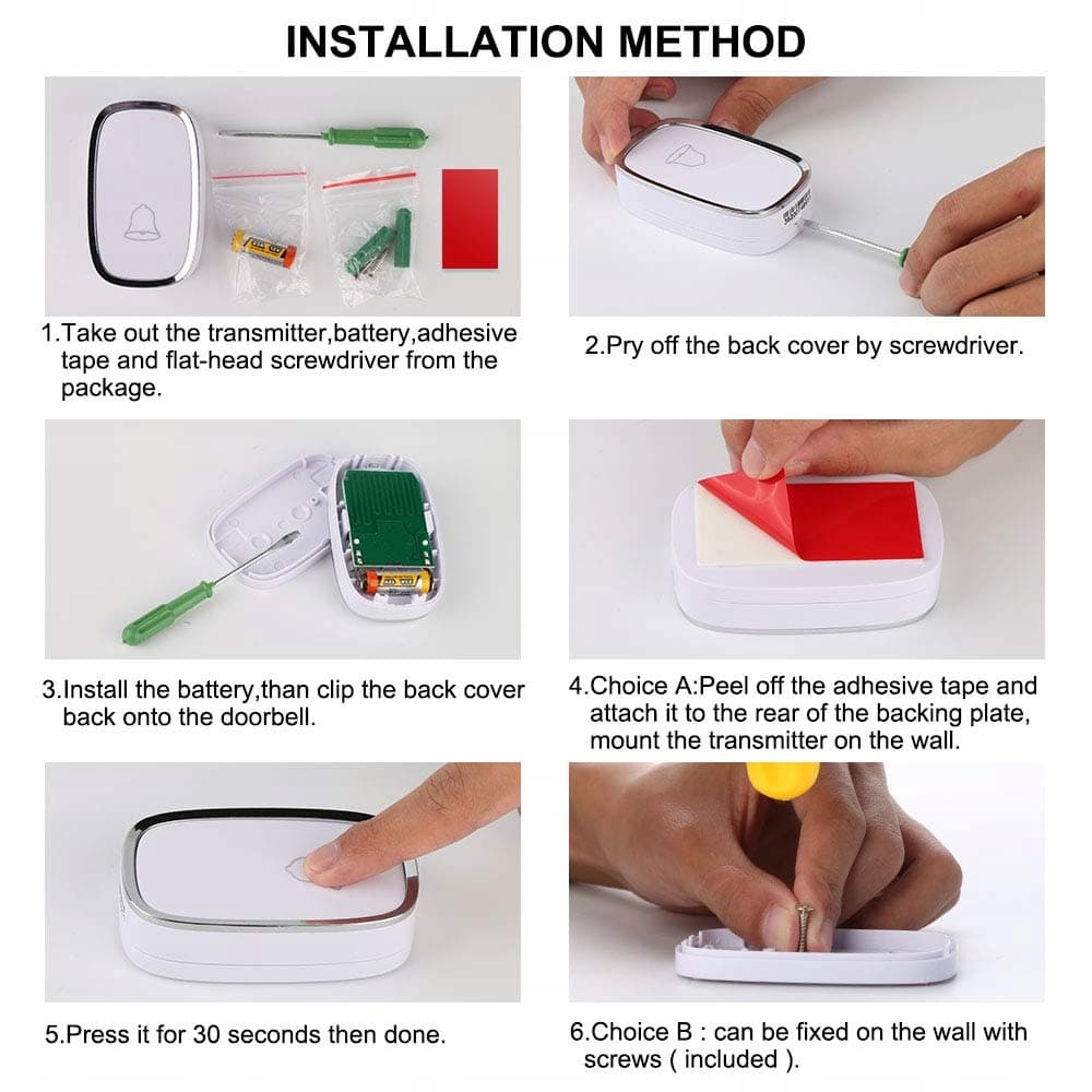 【Wodoodporny i odporny na kurz】IP44 wodoodporny dzwonek bezprzewodowy nadaje się do użytku na zewnątrz. Zakres temperatur pracy od -30°C do 70°C sprawia, że dzwonek bezprzewodowy nadaje się do użytku na zewnątrz. Działa bez zarzutu podczas deszczu, śniegu lub mrozu.