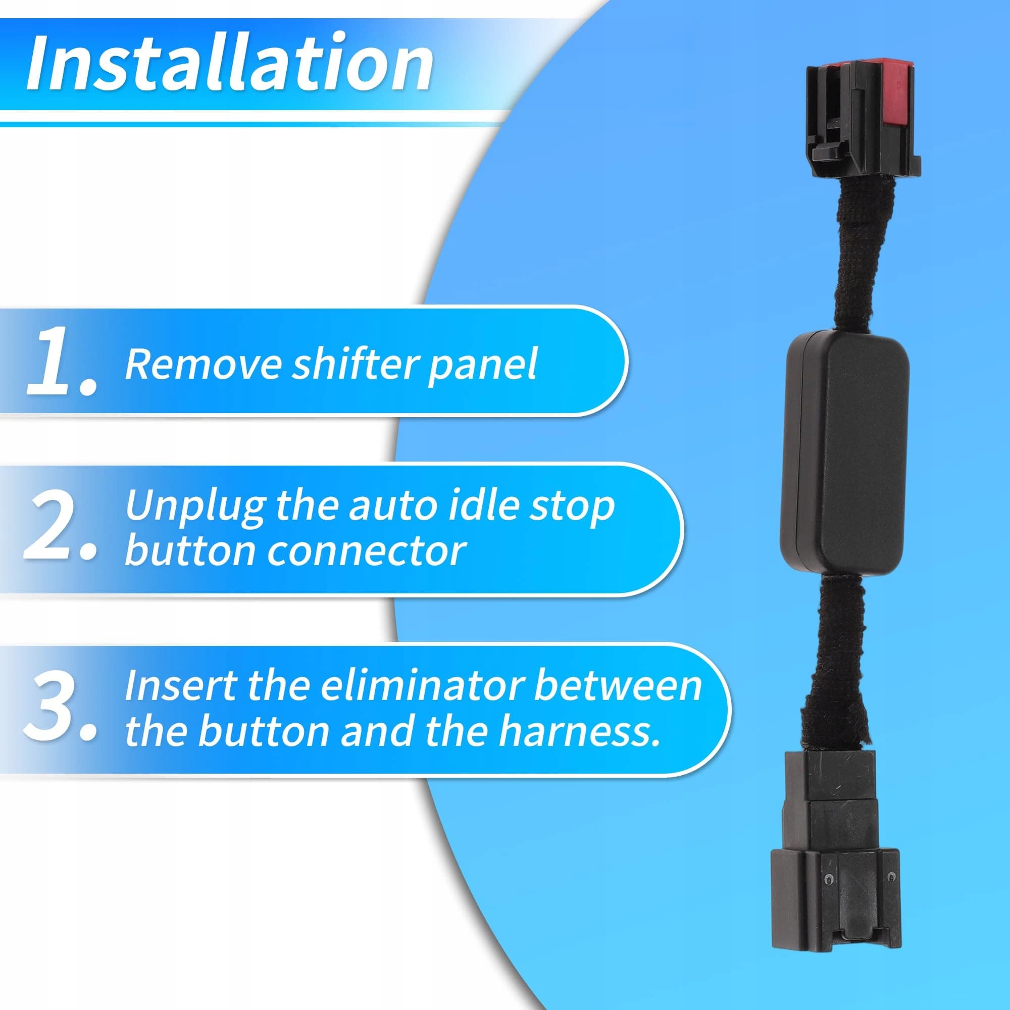 [Instalacja] Plug and Play, brak kodów błędów, brak zmian w okablowaniu, brak programowania, zdjąć pokrywę dźwigni zmiany biegów, odłączyć wtyczkę przycisku Auto Idle Stop i włożyć eliminator pomiędzy przycisk a wiązkę przewodów