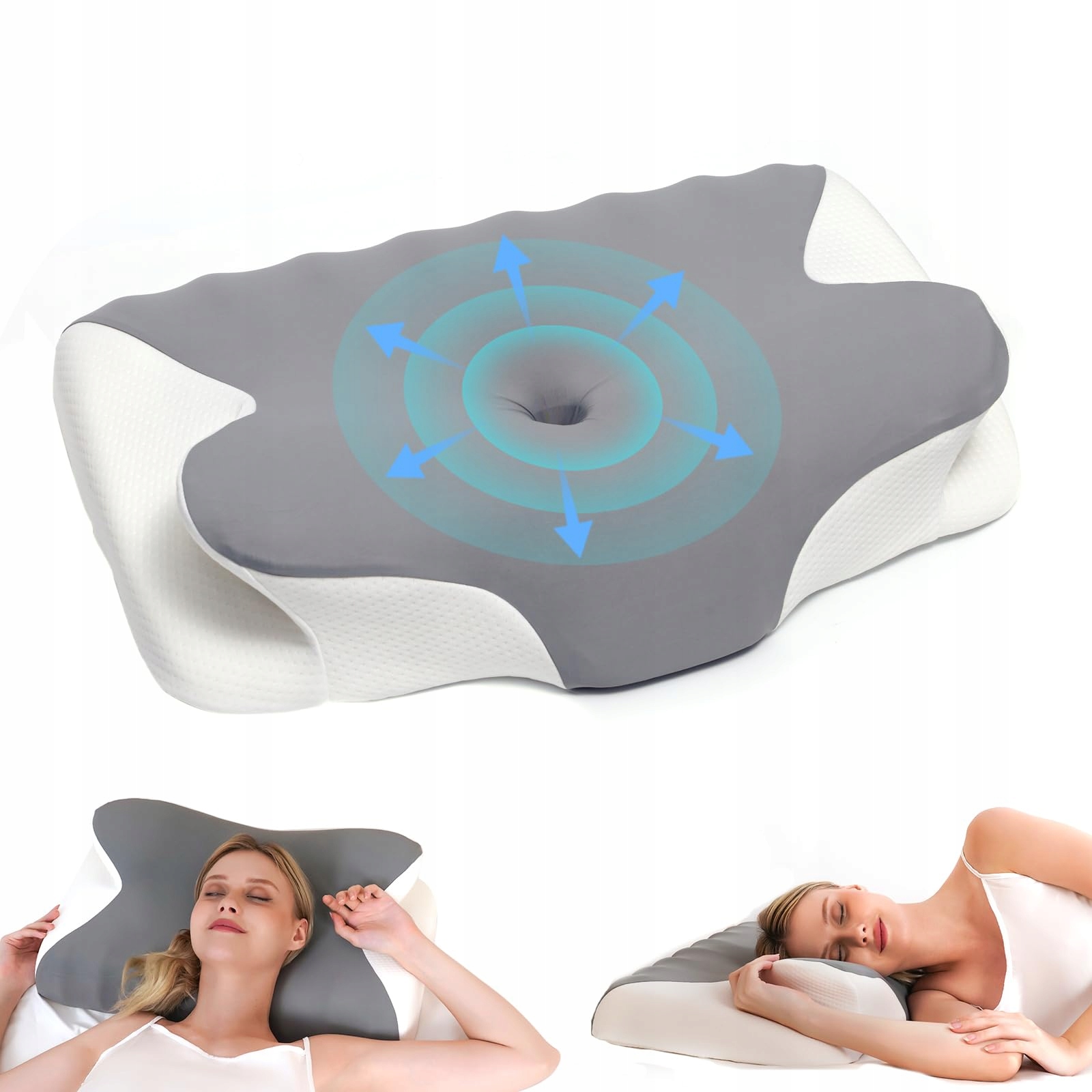 Poduszka dwustronna: Poduszka zapewnia optymalne wsparcie dzięki swojemu kształtowi. Różnej wysokości boki poduszki idealnie dopasowują się do krzywizny szyi