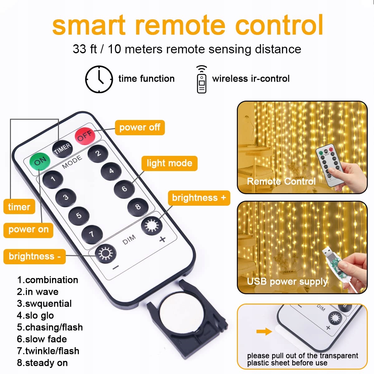 ✅Specyfikacje: Odpowiednia dla fasad kurtyn o długości 3 m i szerokości 3 m. Kabel z wtyczką USB ma długość 3 metrów. 300 LED jest rozmieszczonych na 10 łańcuchach świetlnych, każdy łańcuch ma 30 źródeł światła LED, a odległość między nimi wynosi około 30 cm.