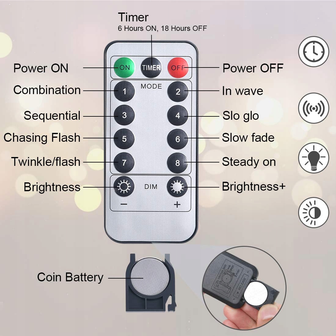 🎄[Inteligentny pilot] - Oferuje 8 trybów świetlnych, w tym kombinację, falowanie, sekwencję, powolne rozjaśnianie, pościg / błysk, powolne zanikanie, migotanie / błysk i stałe światło. Dzięki funkcji timera, można ustawić czas pracy na 6 godzin włączone i 18 godzin wyłączone na dzień.