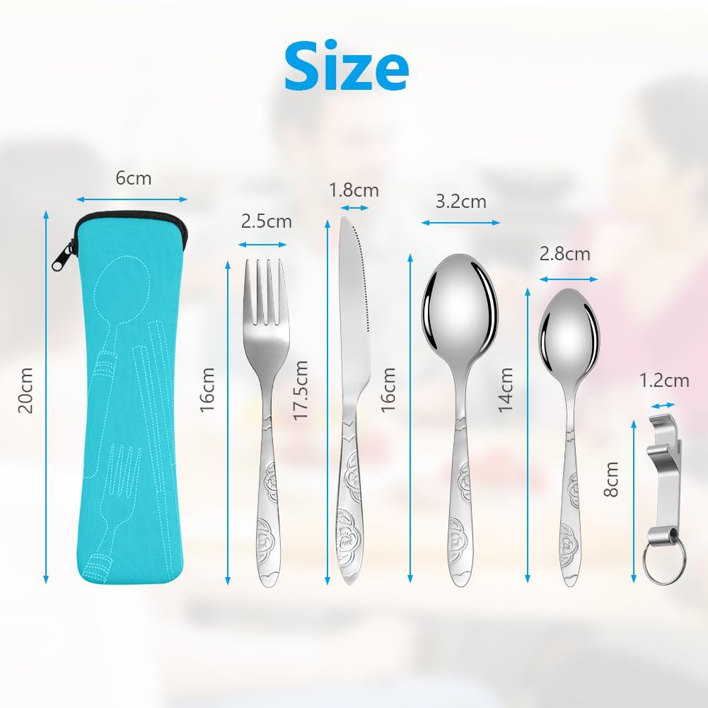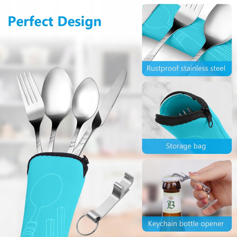 Vicloon Zestaw sztućców kempingowych, 6-częściowy zestaw ze stali nierdzewnej, sztućce turystyczne do kempingu z widelcem, łyżką, otwieraczem do butelek i etui na sztućce, stal nierdzewna do podróży, kempingu, pikniku (Niebieski kwiat)