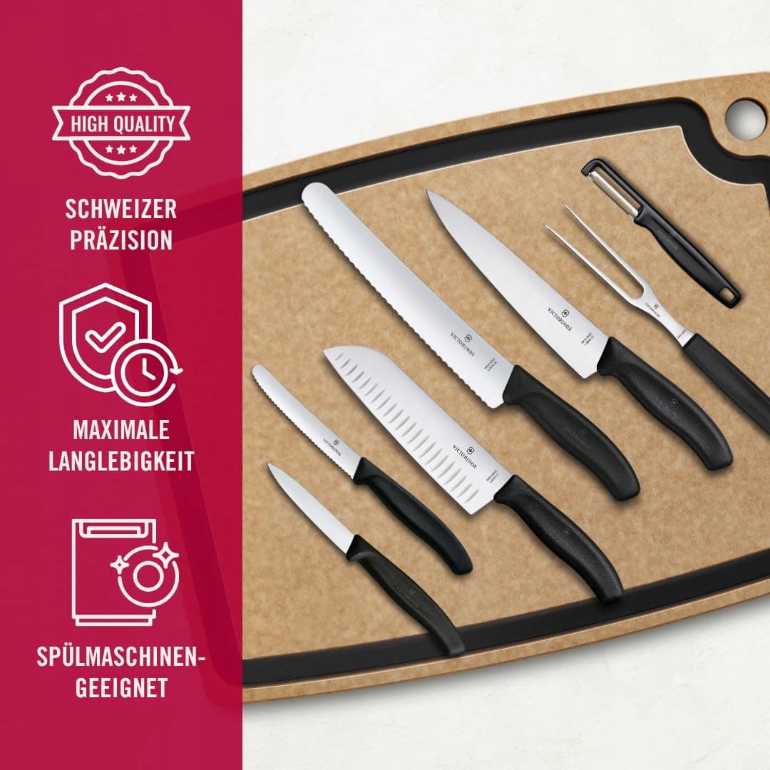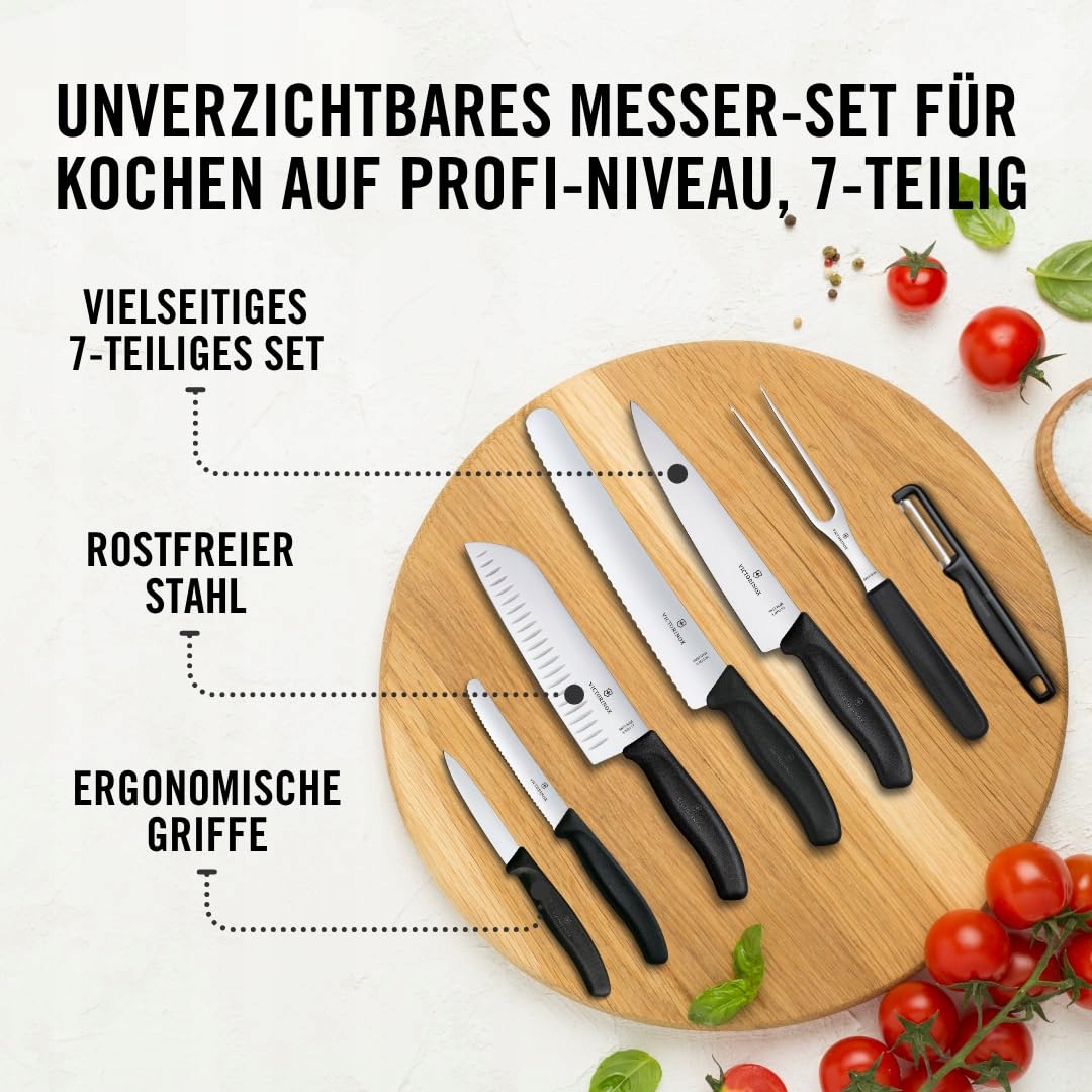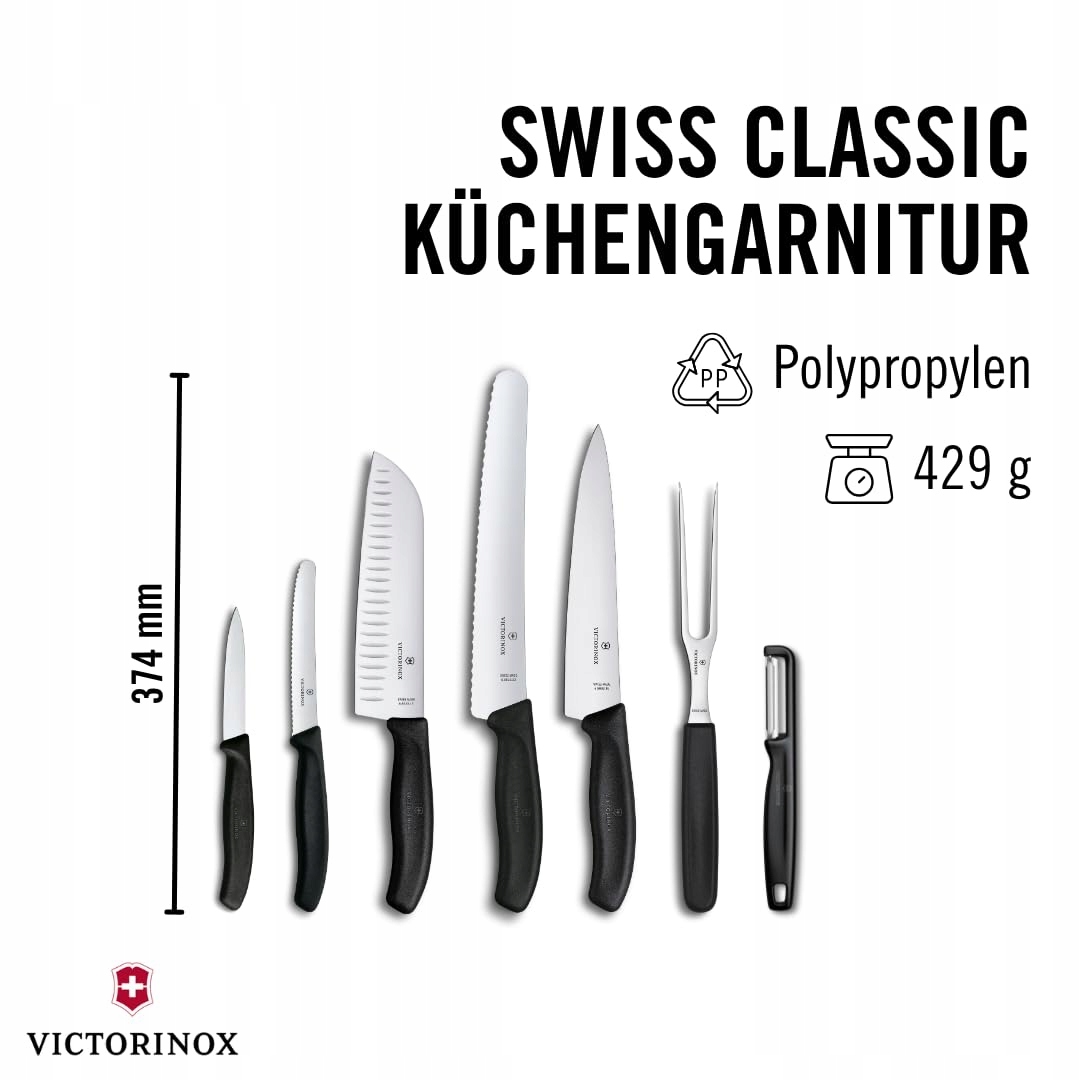 Zestaw noży kuchennych Victorinox Swiss Classic, nóż szefa kuchni, 7-częściowy, w tym nóż Santoku, nóż do chleba, nóż do warzyw, ekstra ostra klinga, czarny