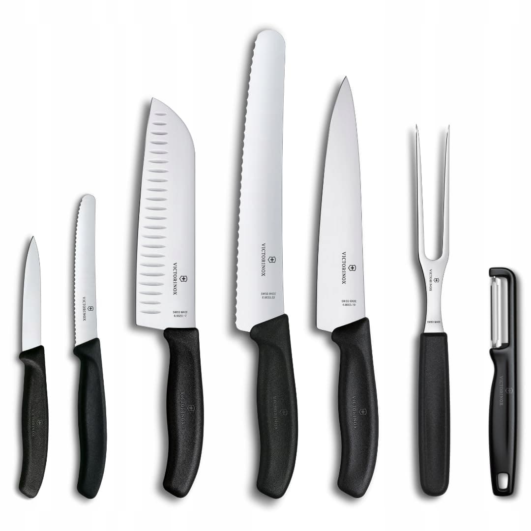 WSZYSTKO, CZEGO POTRZEBUJESZ: Zestaw noży i akcesoriów wykonany w Szwajcarii zawiera nóż do warzyw Swiss Classic, nóż do pomidorów i stół, nóż Santoku, nóż do chleba i ciast, nóż szefa kuchni, widelec do mięsa i pieczeni oraz uniwersalny obierak.