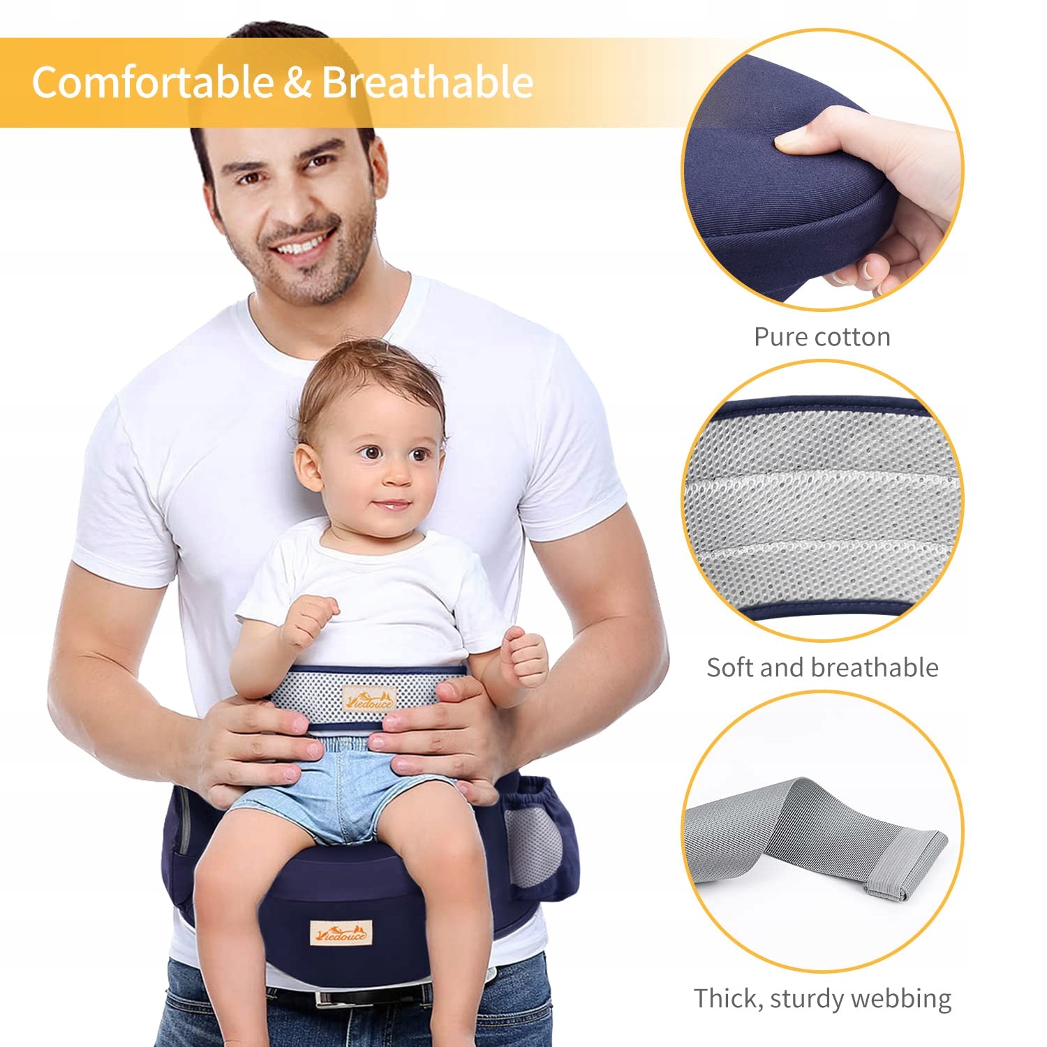 Ergonomiczny nosidełko dla niemowląt Viedouce z pasem bezpieczeństwa, czysta bawełna, lekki i oddychający, ergonomiczny lekki stołek na biodra dla niemowląt w wieku 4-36 miesięcy (ciemnoniebieski)