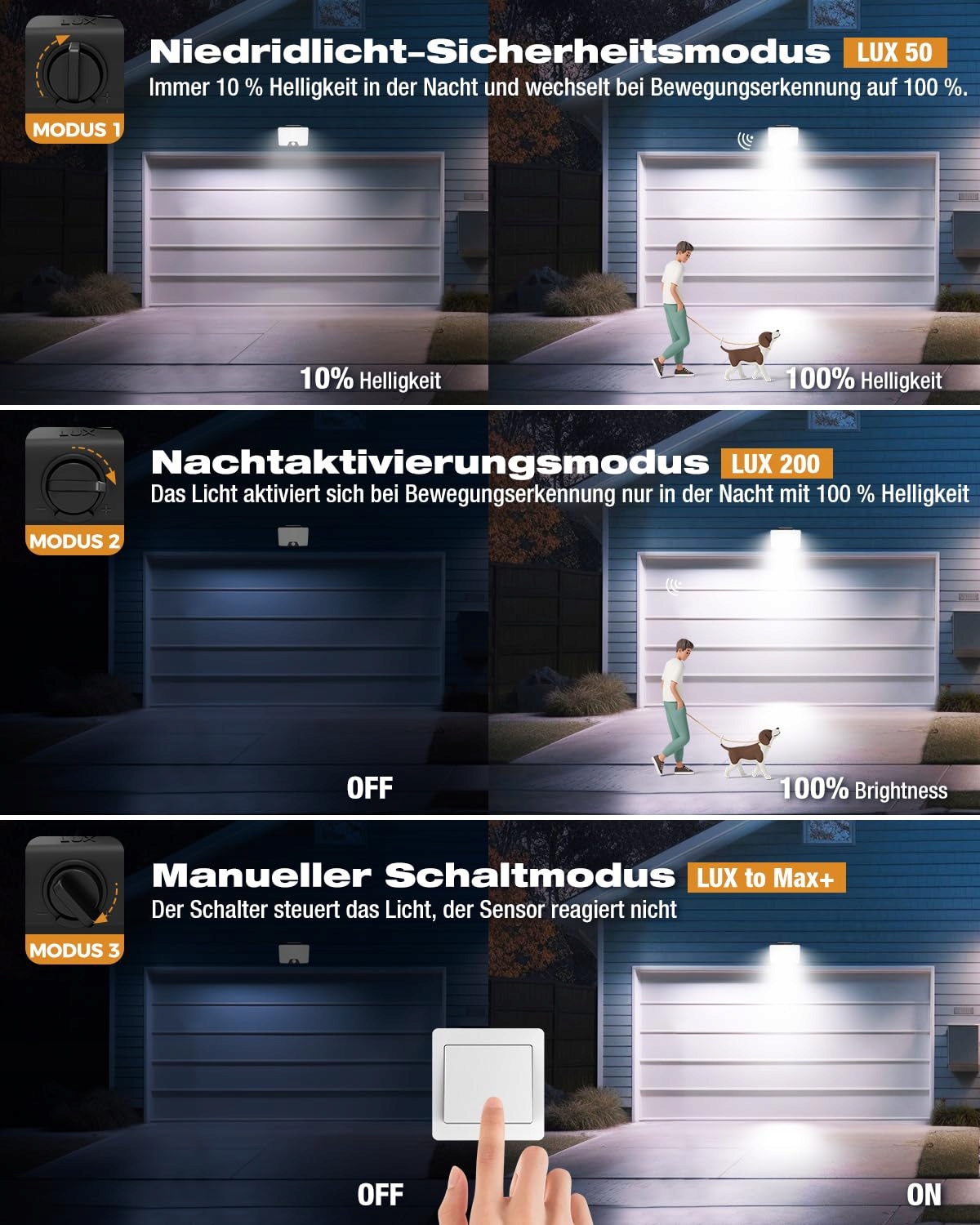 【3 tryby oświetlenia】Nasz reflektor zewnętrzny Vighep z czujnikiem ruchu oferuje trzy elastyczne tryby: 1. Tryb niskiego światła bezpieczeństwa (LUX=50): Zawsze 10% jasności w nocy, przełącza się na 100% po wykryciu ruchu. 2. Tryb aktywacji nocnej (LUX=200): Światło włącza się przy ruchu tylko w nocy z jasnością 100%. 3. Tryb ręcznego przełączania (LUX=MAX+): Przełącznik steruje światłem, czujnik nie reaguje
