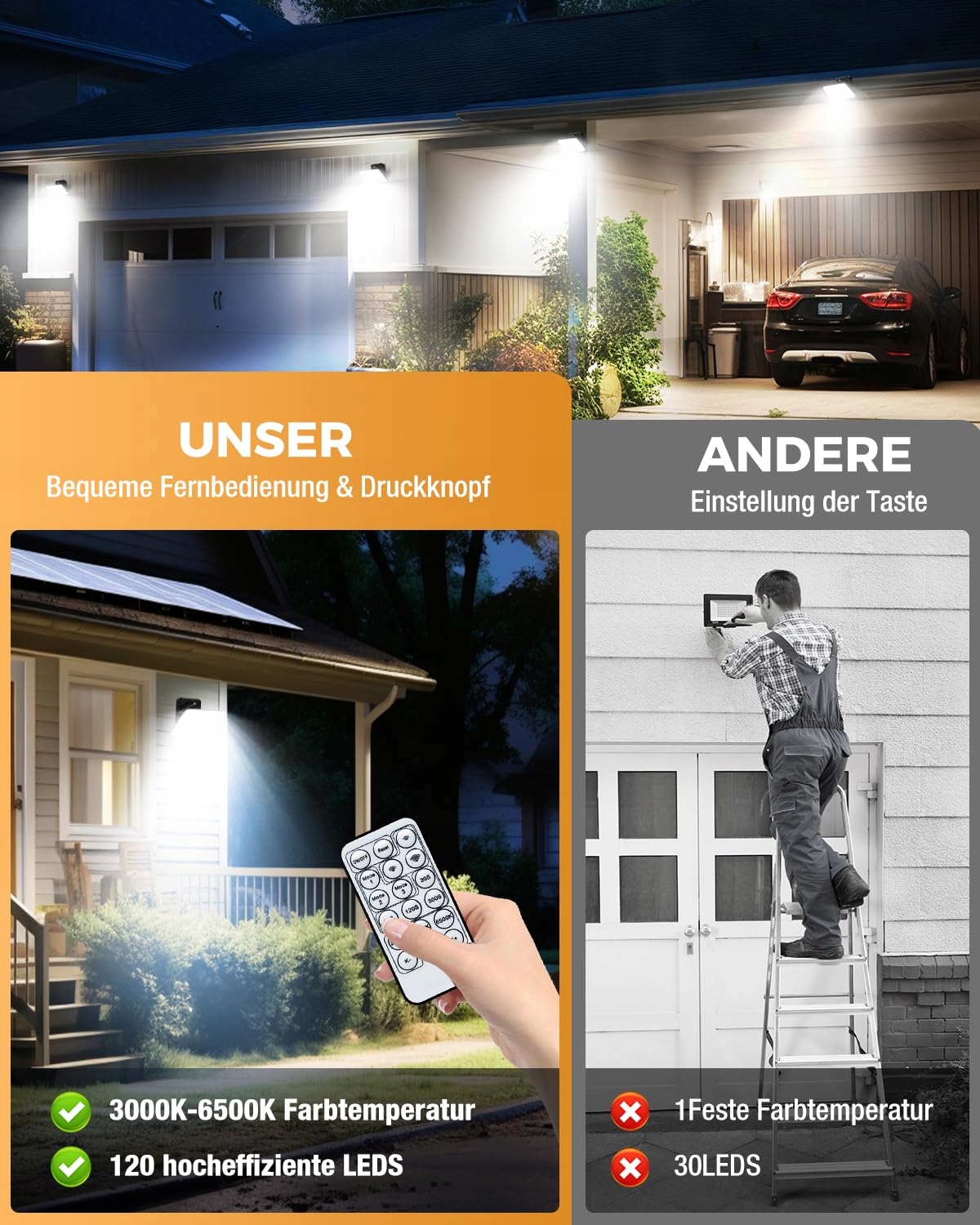 【Prosty i szybki montaż】Zainstaluj swoje reflektory bezpieczeństwa PIR w zaledwie 4 krokach i 5 minut! Skorzystaj z naszej instrukcji obrazkowej, aby przebiegł bezproblemowo. Ciesz się oświetleniem bez cieni o kącie 180° i szerokim rozproszeniu światła. Idealne do różnych miejsc, takich jak ogrody, garaże, werandy i podwórka