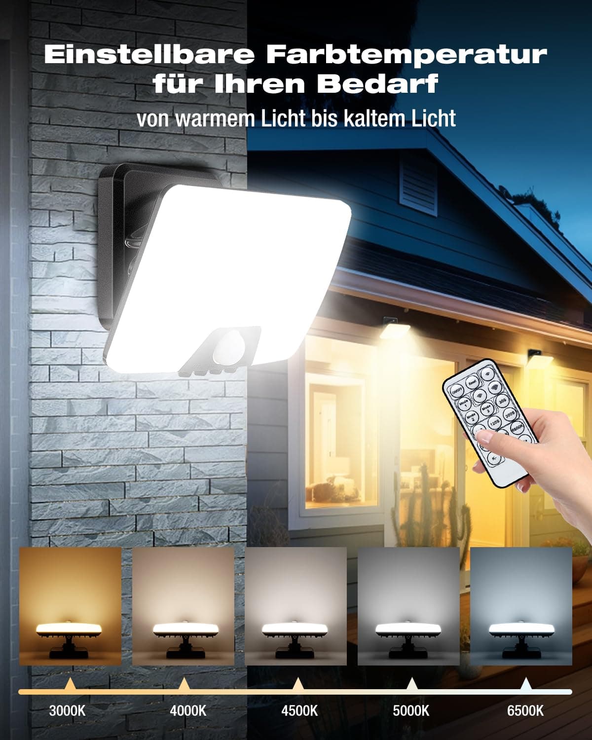 【5 temperatur barwowych】Nasza lampa LED zewnętrzna oferuje 5 temperatur barwowych od 3000K do 6500K. 3000K ciepła biel – przytulna atmosfera w ogrodzie. 4000K-5000K neutralna biel – naturalne światło na wieczorne spotkania. 6500K zimna biel – oświetl ścieżki i ważne obszary jasnym światłem dla zwiększonego bezpieczeństwa. Dopasuj oświetlenie zewnętrzne do każdej chwili, niezależnie czy szukasz przytulnej wygody, czy solidnego bezpieczeństwa
