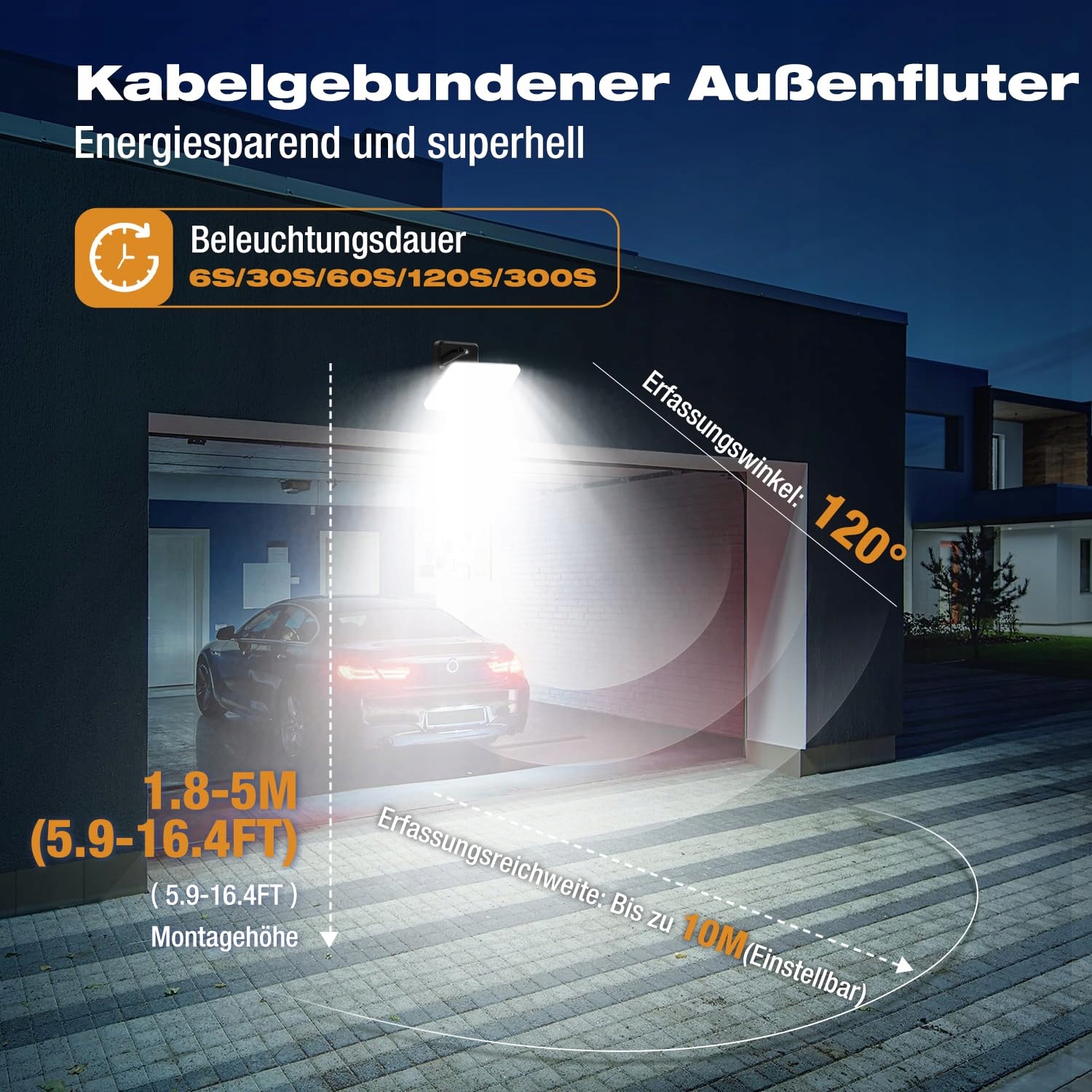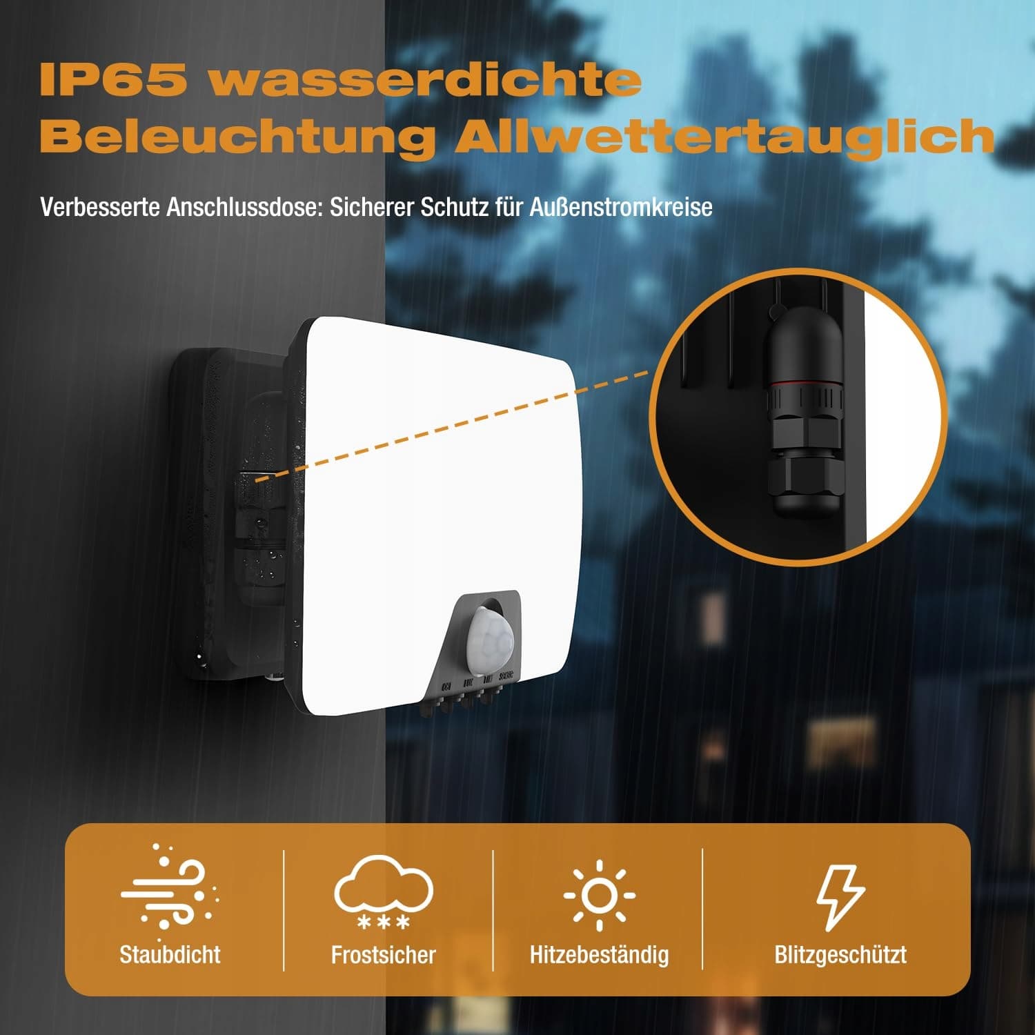 【Czujnik ruchu i oszczędność energii】Nasze reflektory zewnętrzne wyposażone są w zaawansowany czujnik podczerwieni zapewniający natychmiastowe i bardzo jasne oświetlenie – bez potrzeby ręcznego włączania. Jednocześnie nasze reflektory zewnętrzne oszczędzają do 90% energii w porównaniu z tradycyjnymi halogenami, co czyni je ekonomicznym i ekologicznym wyborem