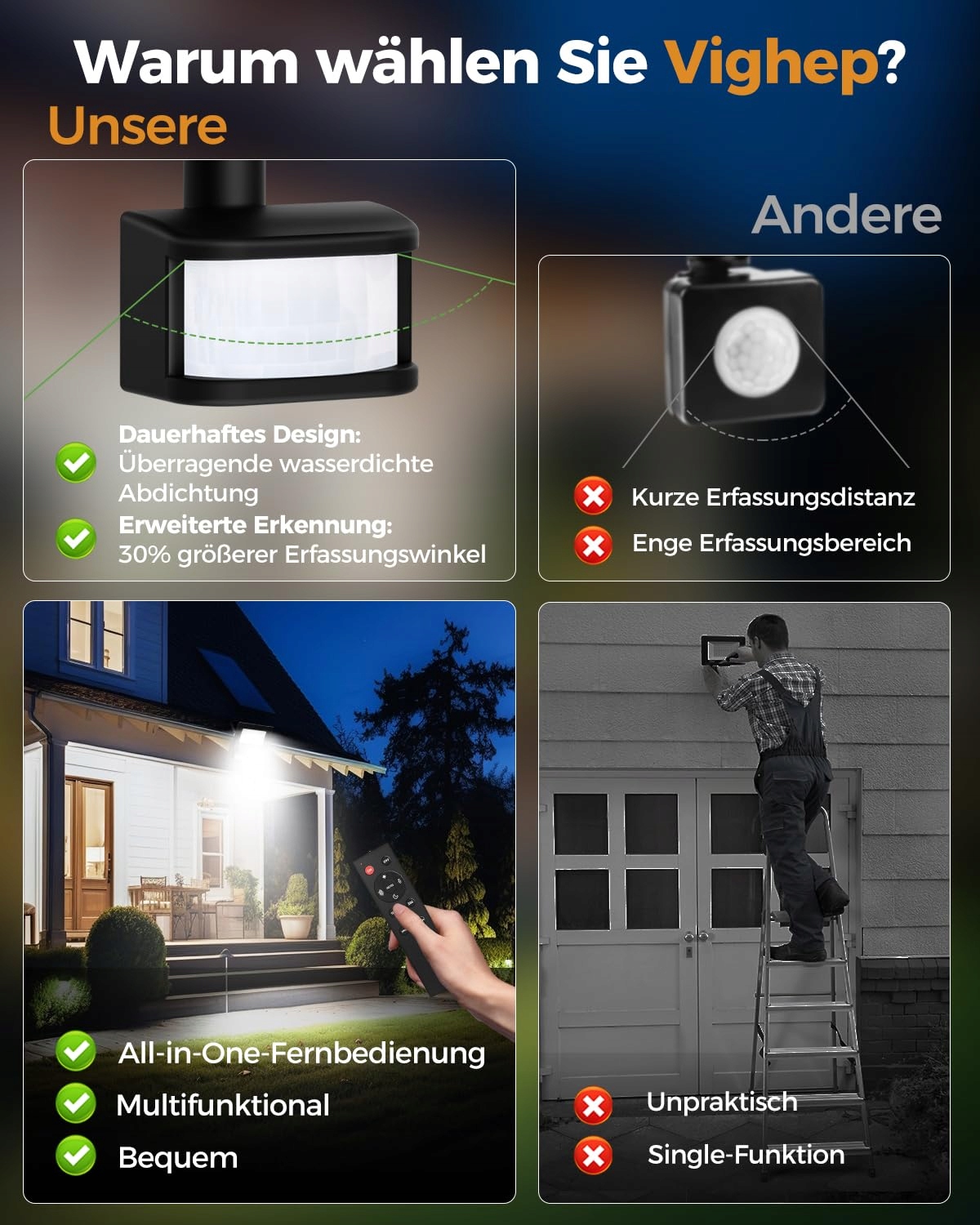 【Ulepszony czujnik PIR】: Nasze reflektory z czujnikiem ruchu na zewnątrz wyposażone są w zaawansowane wykrywanie podczerwieni dla natychmiastowego i bardzo jasnego oświetlenia – bez konieczności ręcznego przełączania. Zasięg i czas wykrywania można regulować za pomocą pilota. Dzięki solidnej technologii uszczelniania i większej, zakrzywionej głowicy czujnika ciesz się o 30% szerszym kątem wykrywania dla wyższej czułości, zmniejszając fałszywe alarmy i poprawiając bezpieczeństwo